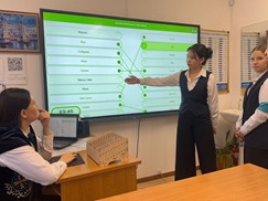 На уроке английского языкав 8 В классе была проведена игра “Кiм бiлгiр?”. Ребята соревновались на казахском и английском языках. Девиз - “Мемлекеттік тіл – менің тілім”. Цель: популяризировать богатство казахского языка и углубить знания английского языка.