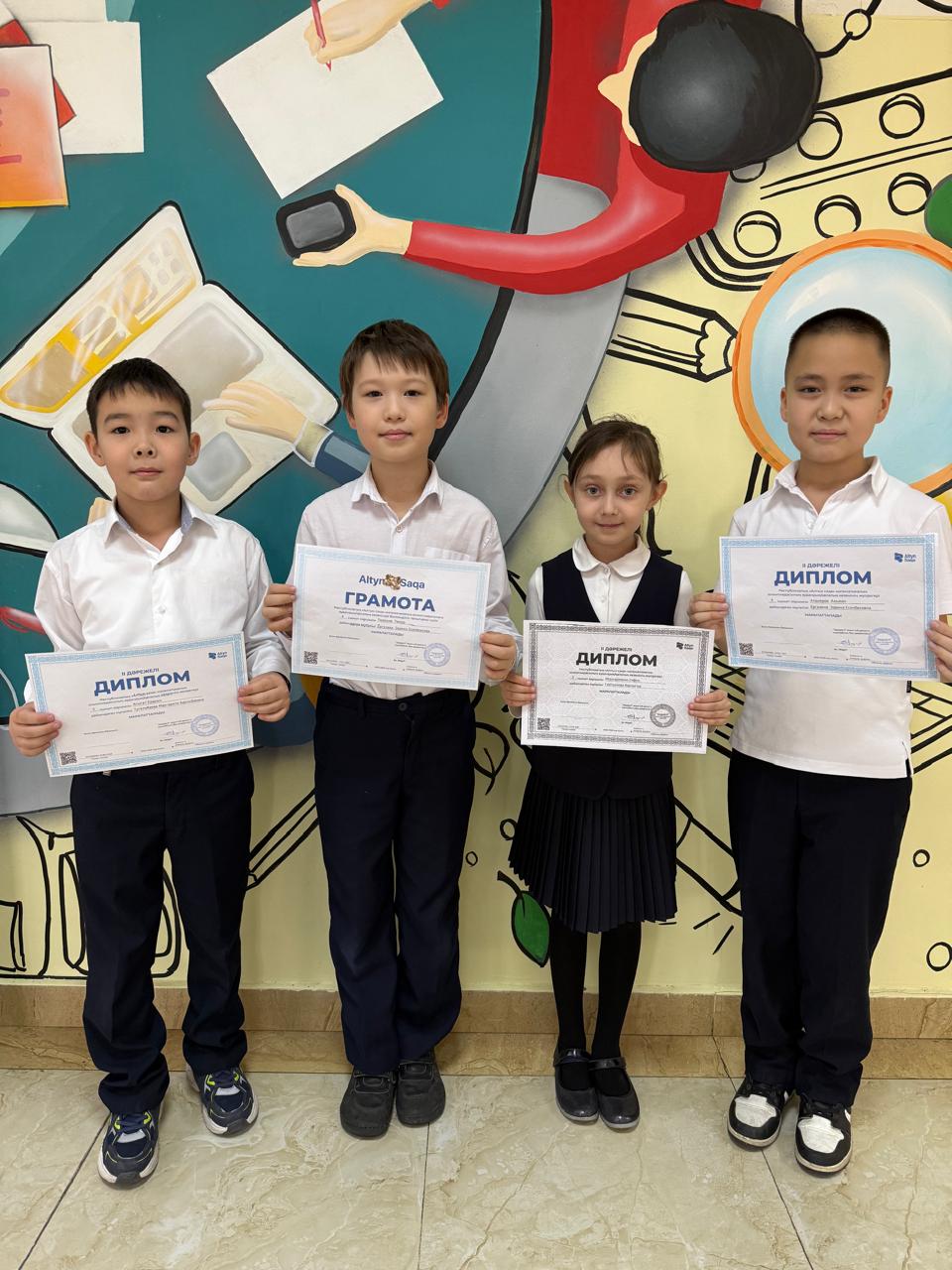 4 учащихся 3–4 классов КГУ «Гимназия-18» 15 ноября 2025 г. приняли участие в районном этапе олимпиады «Алтын сақа» и достойно проявили себя, заняв призовые ІІ места.