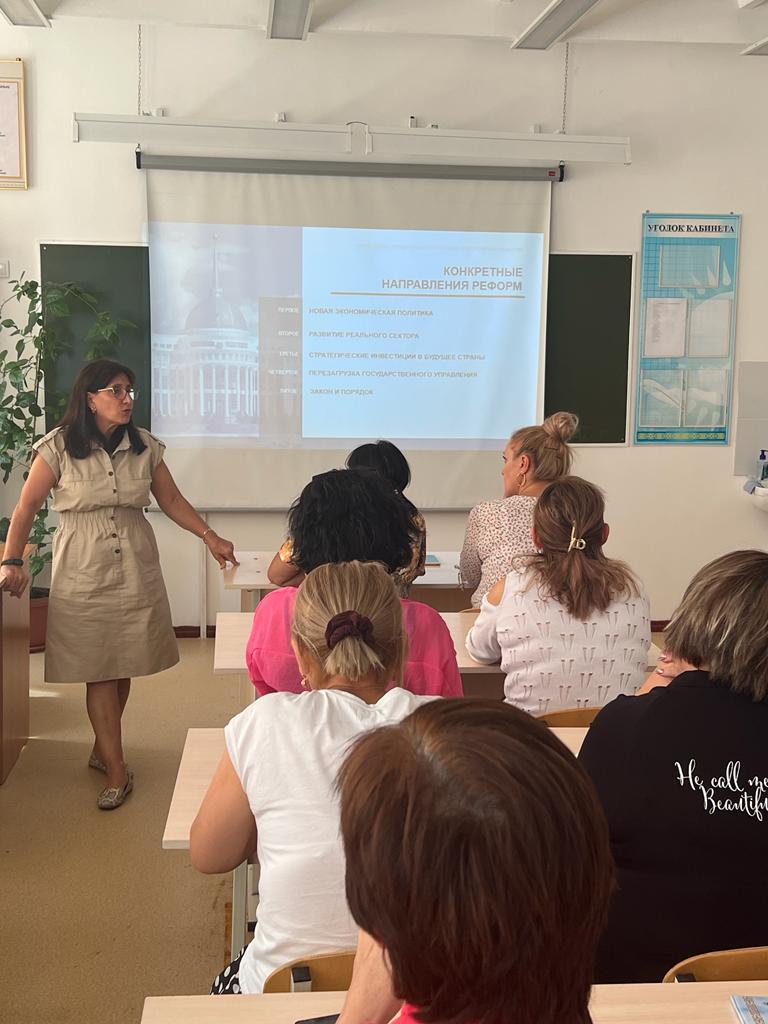09.09.22 г КГУ ,,Гимназия 18’’ состоялось совещание педагогов, на котором директором гимназии Наурызбаевой Г.К. и учителем истории Алиевой Г.А была дана информация об основном содержании Послание президента РК от 01.09.2022 г. Гульджамиля Каратаевна остановилась на пяти направлениях реформ,которые были озвучены в Послании. Особый интерес у педагогов вызвало третье направление: стратегические инвестиции в будущее страны, в рамках которого было рассказано о проекте ,, Комфортная школа ‘’. Совещание прошло интересно и продуктивно.