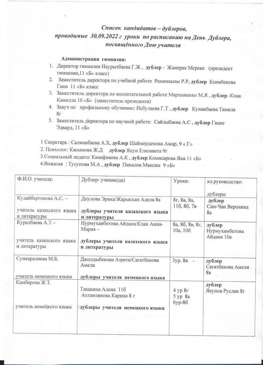 В преддверии Дня Учителя 30.09.22 г в гимназии проводится «День Дублера». Организаторы проведения «Дня Дублера»- школьный Совет старшеклассников и педагогический коллектив. Участники «Дня Дублера» обучающиеся гимназии.В роли администрации и педагогов учащиеся 8-11 классов