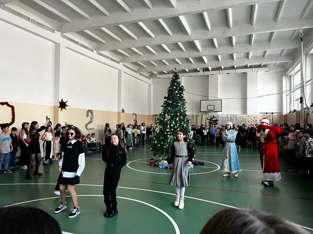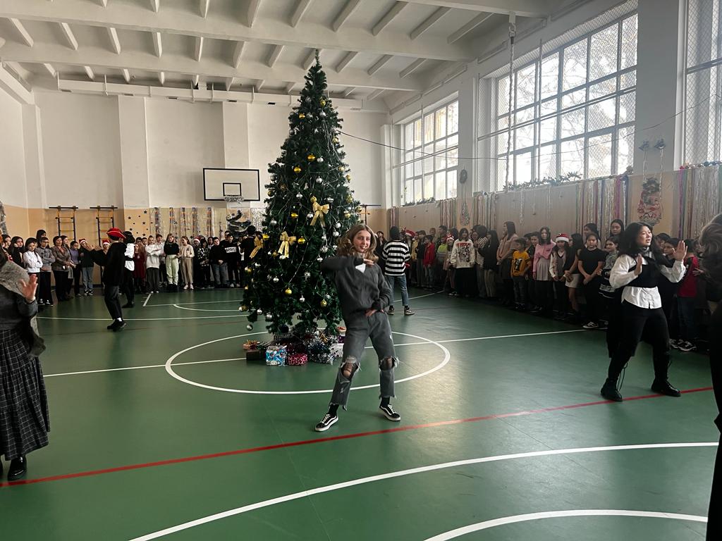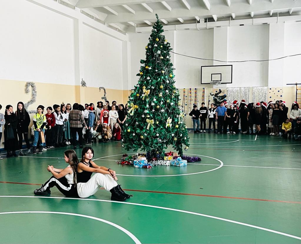 Учащиеся показали театрализованное представление с участием новогодних персонажей -Деда Мороза, Снегурочки, Бабы Яги, разбойников. Дети с удовольствием наблюдали за происходящим, бурно и активно участвовали в играх, водили хоровод вокруг елки.Зажигательные танцевальные номера показали учащиеся 6 а,б,в,г классов.