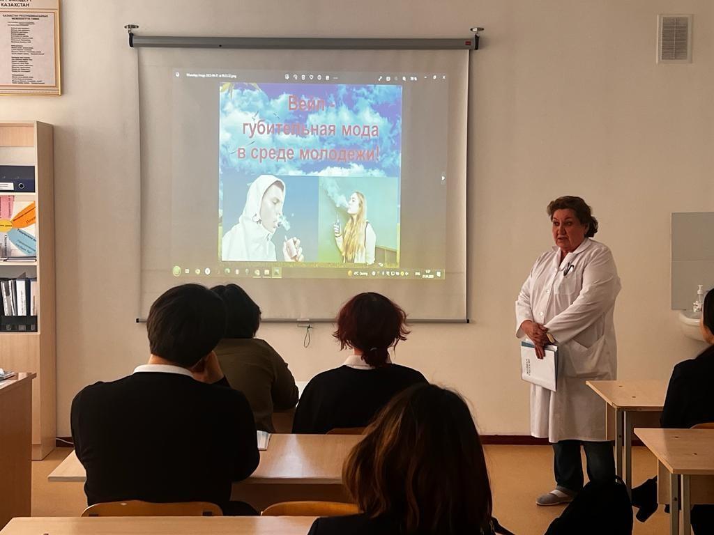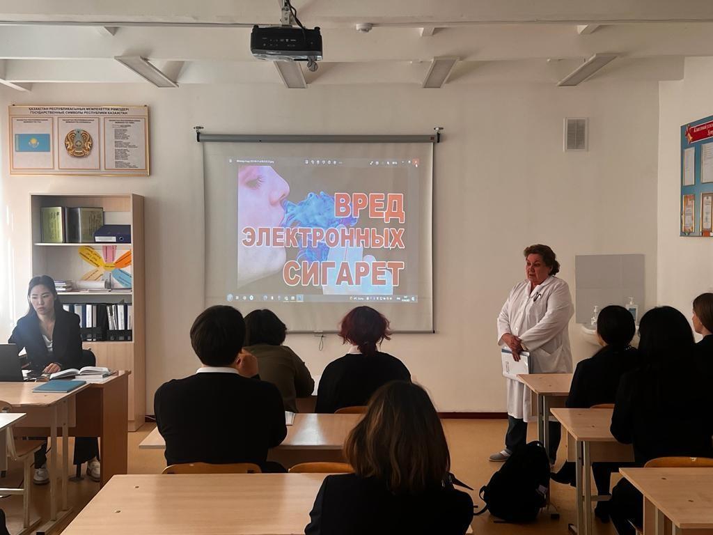 Медбике Мошкарева Л.С. гимназия оқушылары арасында электронды темекінің зияны туралы профилактикалық әңгіме жүргізді.