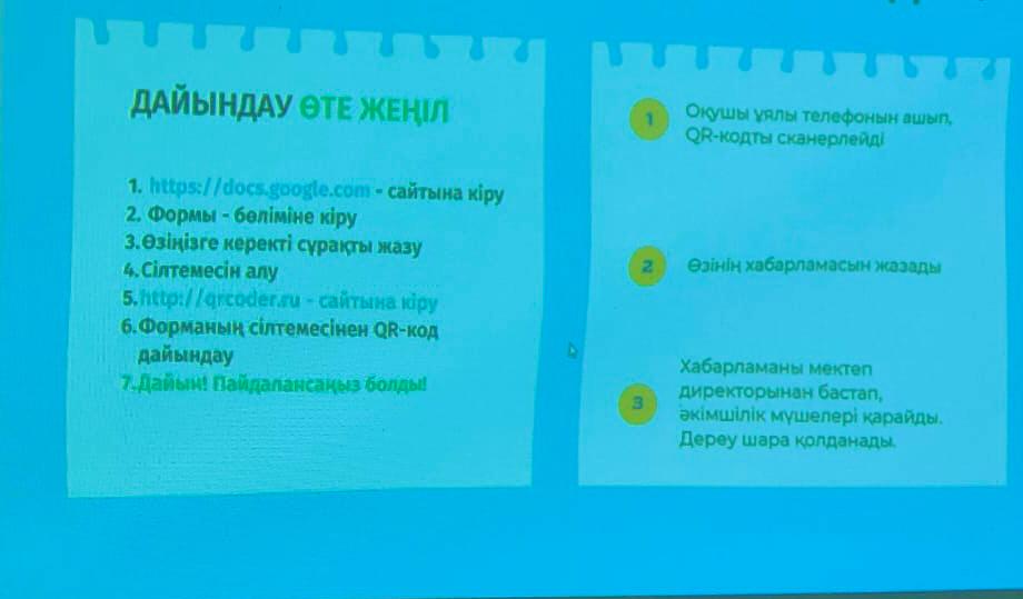 2023 жылдың 17 мамырында қалалық прокуратурамен кеңес өткізілді. Қарастырылған мәселелердің бірі – мектеп қабырғасында қорлаудың алдын алу үшін QR кодын орналастыру мәселесі болды. Біздің гимназия Алатау өңірі мектептерінің оң тәжірибесін қабылдап, сыныптарға QR кодтарын орналастыруды шешті. QR кодын сканерлеу арқылы оқушылар орын алған жағдайды хабарлап, көмек сұрай алады.