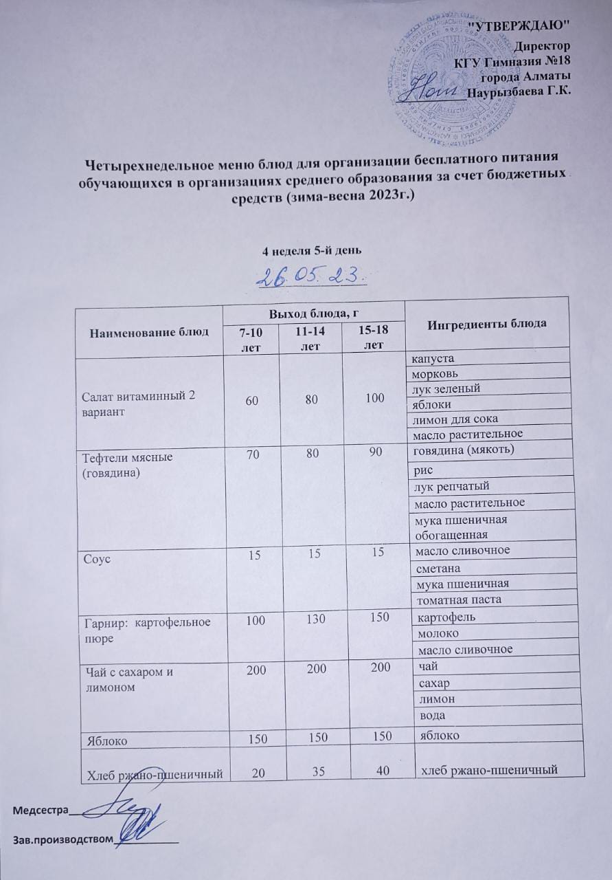 26 мамыр 2023 0 1 2 3 4 5 Оқушыларға тегін берілетін тағамдардың мәзірі (қаңтар-мамыр) 4 апта 5 күні Осы беттің QR-коды:QR-код этой страницы: