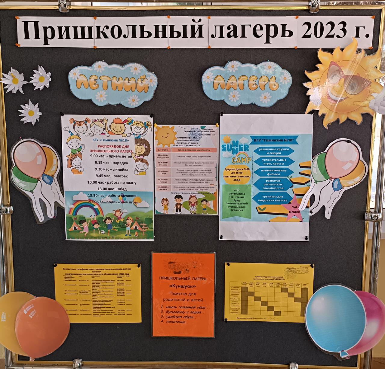 Ауысым барысында балаларды әртүрлі тақырыптық оқиғалар күтеді. Олардың арасында шығармашылық және күлкі күндері,саябақтар мен кинотеатрларға саяхат болады. Мектеп жанындағы лагерьдегі ауысымның ұзақтығы-10 күн. Біздің тәжірибелі мұғалімдер балалармен жұмыс істейді. Осы уақыт ішінде балалар ойын—сауық іс-шараларының барлық түрлеріне қатысады, ең бастысы-жақсы демалып, денсаулықтарын нығайта алады!