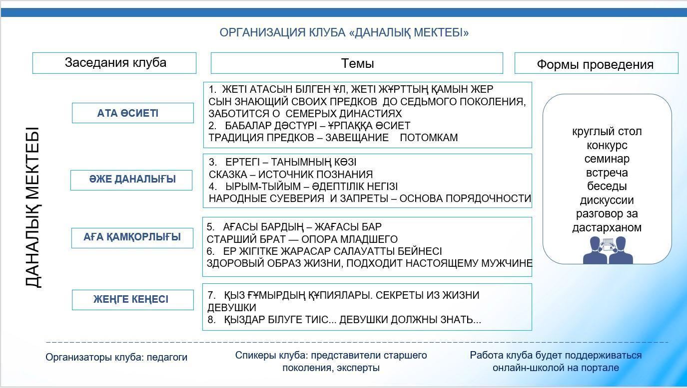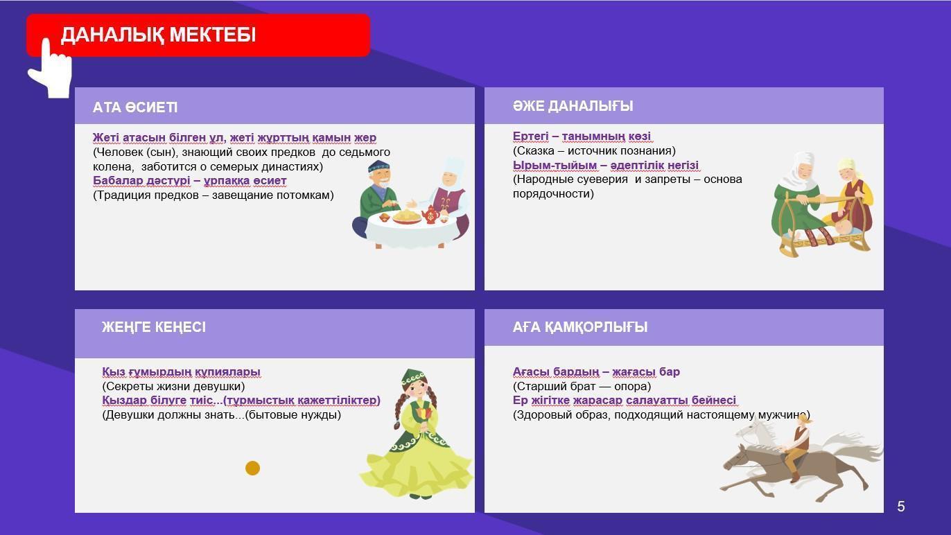 ● Ұлттық мәдениет, құндылықтар мен дәстүрлердің сабақтастығы;