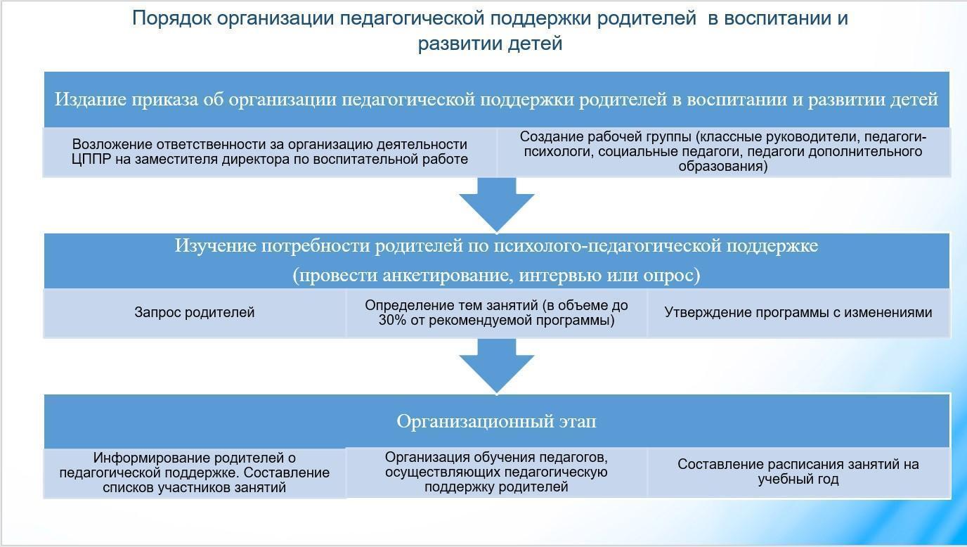 1) организация системной педагогической поддержки родителей для развития педагогической культуры, психолого-педагогических и социальных компетенций родителей для обеспечения благополучия детей;
