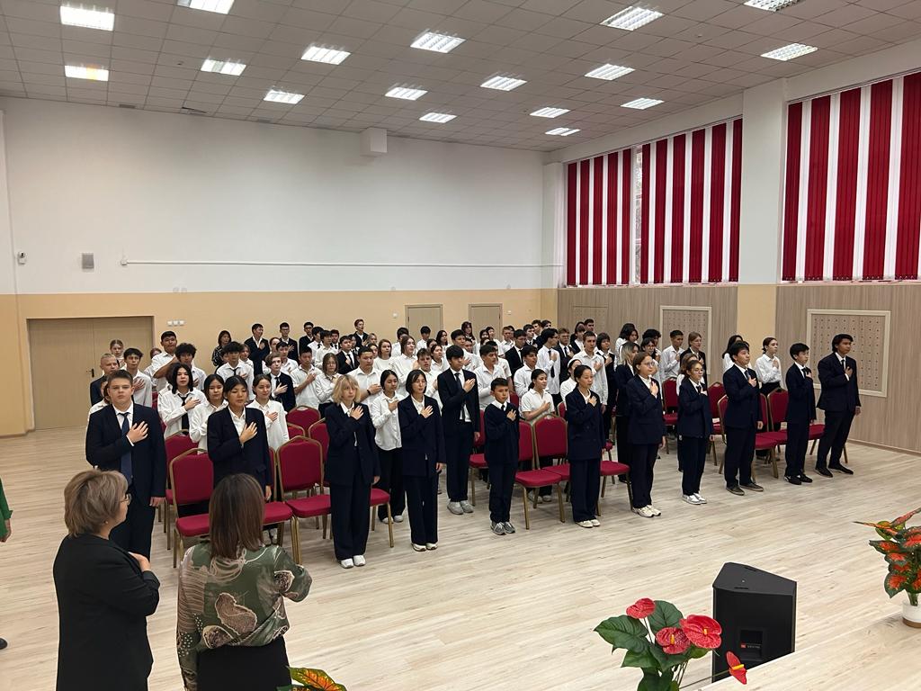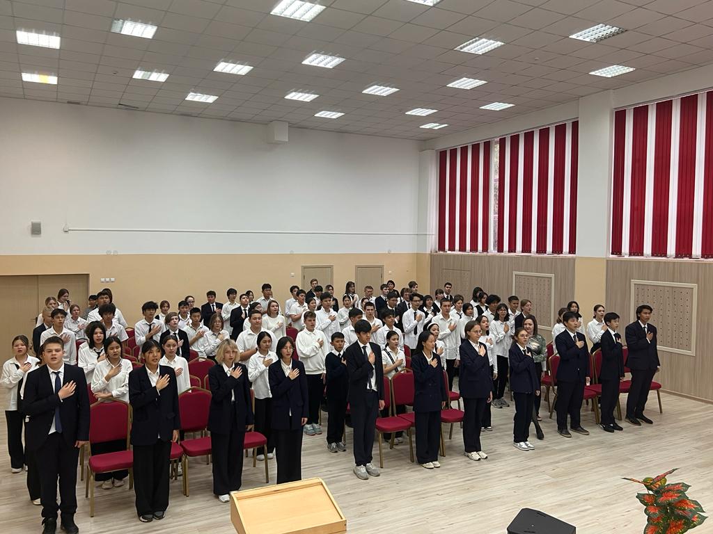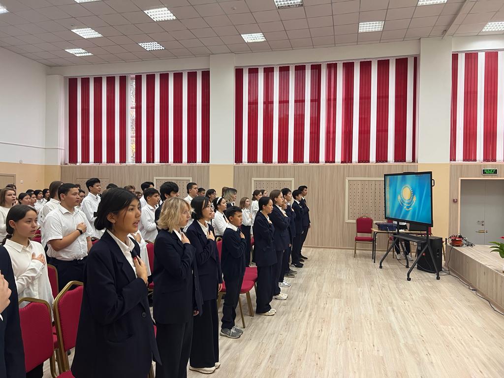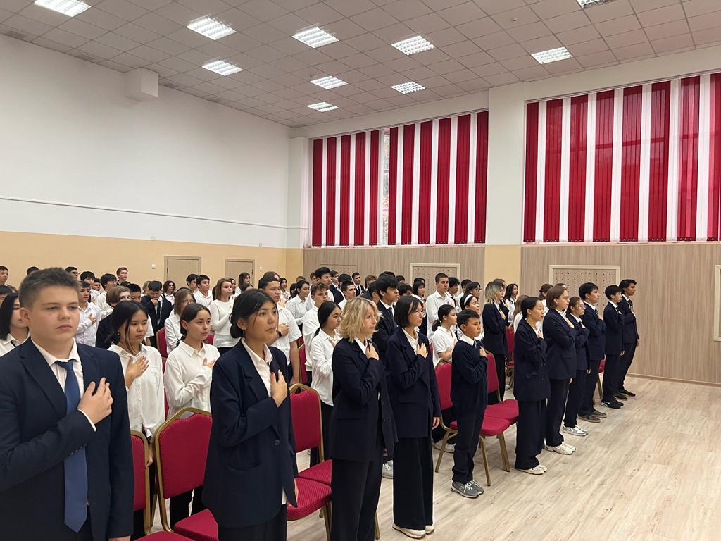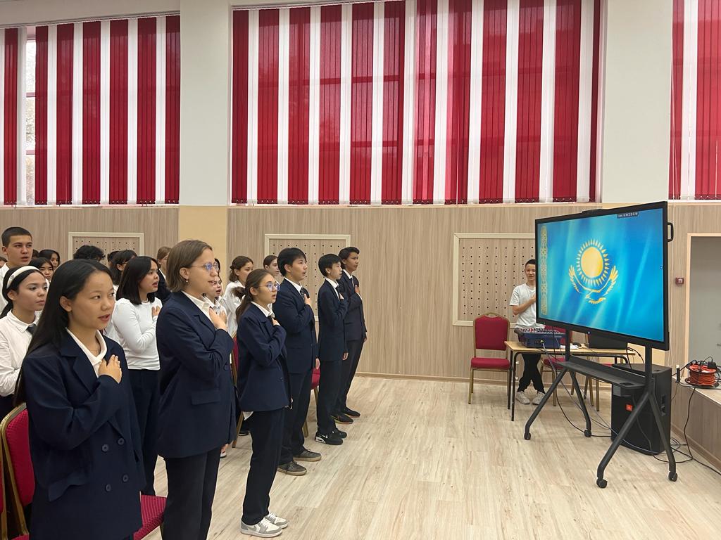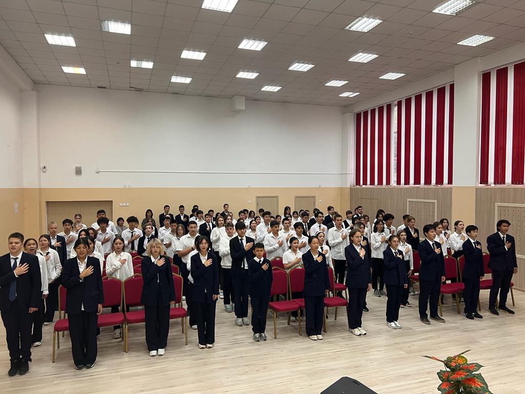 23.10.2023 күні сағат 12.00-де гимназияның мәжіліс залында Қазақстан Республикасының мемлекеттік әнұраны жаппай орындалды. Шараға 8-11 сынып оқушылары қатысты.