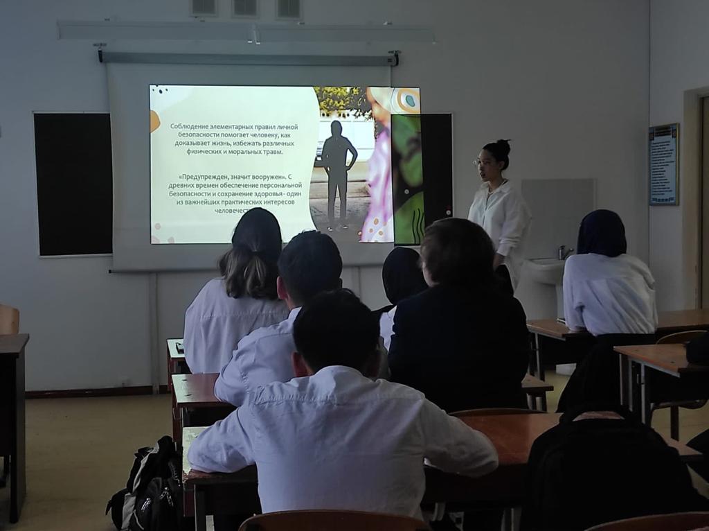 Оқушыларды әр түрлі қауіпті жағдайлармен таныстыру және олардың алдын алу үшін дұрыс мінез-құлыққа үйрету, өз өмірінің қауіпсіздігіне жауапкершілік сезімін ояту мақсатында «Құқық және тәртіп» Фракциясы (Жоғары сынып оқушылар Кеңесі) 8-сынып оқушыларымен «Қоғамдық және жеке қауіпсіздік» тақырыбында әңгіме өткізді.