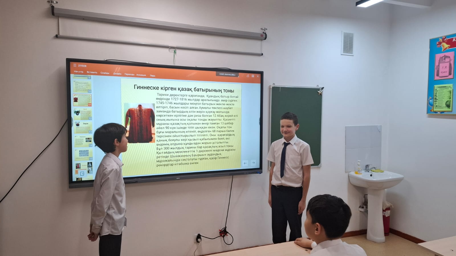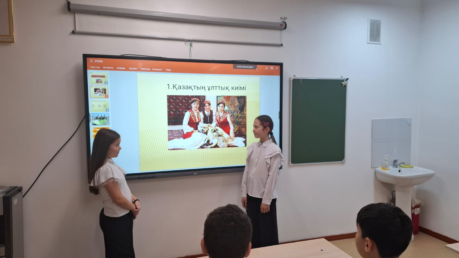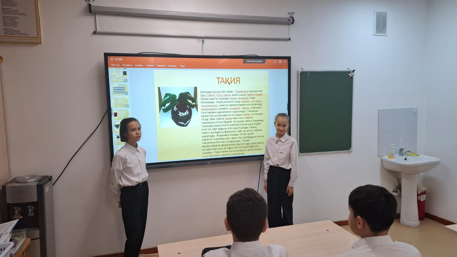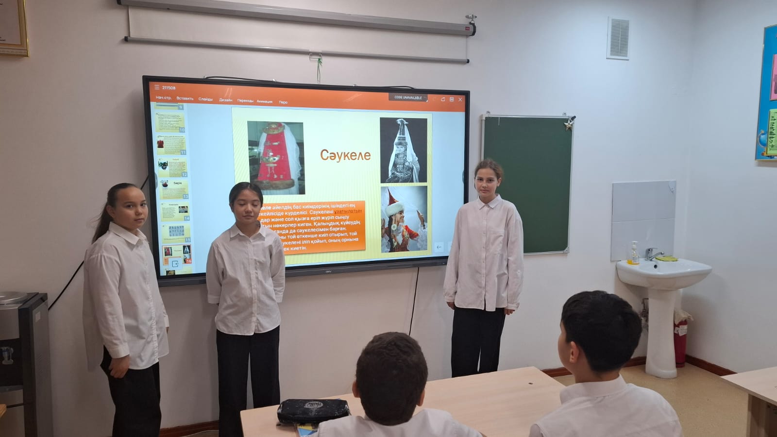 В рамках мероприятия "Мемлекеттiк тiл - Менiң тiлiм" в КГУ "Гимназия №18" учителями истории было проведено внеклассное мероприятие на тему "Материальная культура казахского народа" среди учеников 6 А класса. На данном мероприятии были представлены элементы казахской национальной одежды.