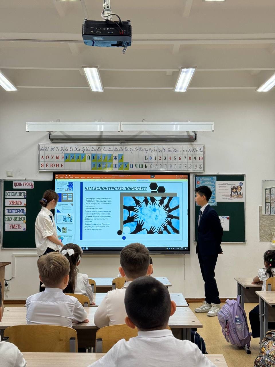 2024 жылғы 2 желтоқсан күні «Волонтерлік» фракциясы 1-сынып оқушыларына арналған «Волонтерлік дегеніміз не?» тақырыбында сынып сағатын өткізді.