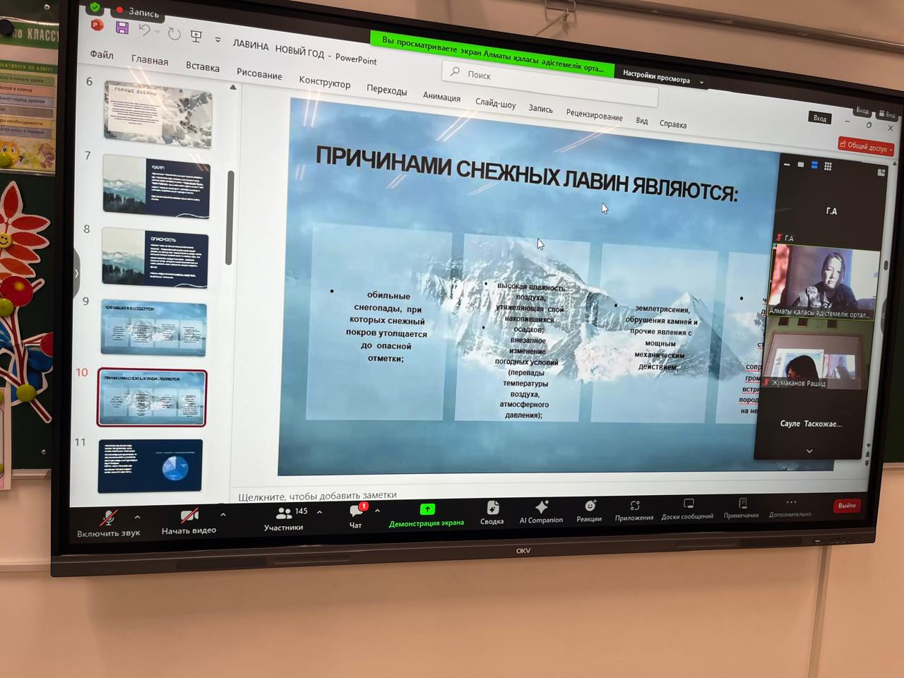 09.12.2024 ж сағ 14:00 5-6 сынып арасында «Аблайлаңыз, қар көшкіні» тақырыбында Zoom платформасында конференция өтті .Оқушылар қар көшкіні туралы мағлұматтар ала отырып, қар көшкіні кезіндегі қауіпсіздік ережесін қалай сақтауға болатынын және қар көшкіні қатері мен көшкін жүру кезіндегі өзін- өзі ұстаудың қауіпсіздік ережелерімен толық танысты.