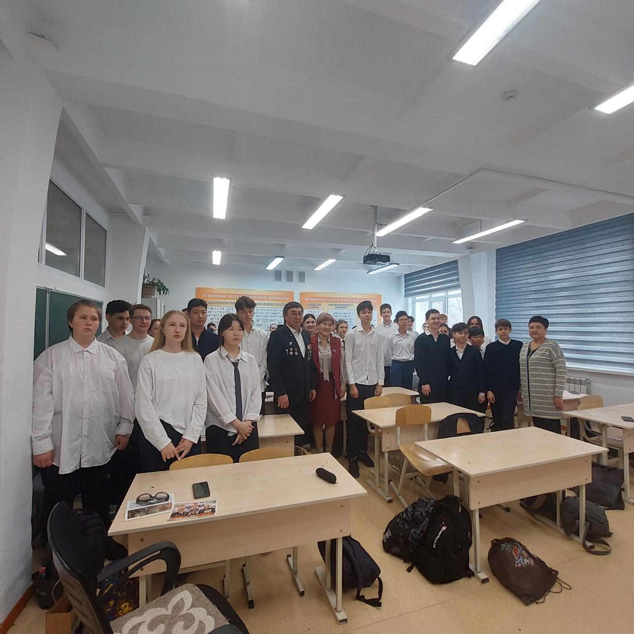 Ауғанстаннан әскердің шығарылған күні 9 «Г» сыныбының жетекшісі Ракишева З.М. мен 8 «Г» сыныбының жетекшісі Тасыбаева Т.С. ауған соғысының ардагері Кунанбаев А.-мен кездесу өткізді.