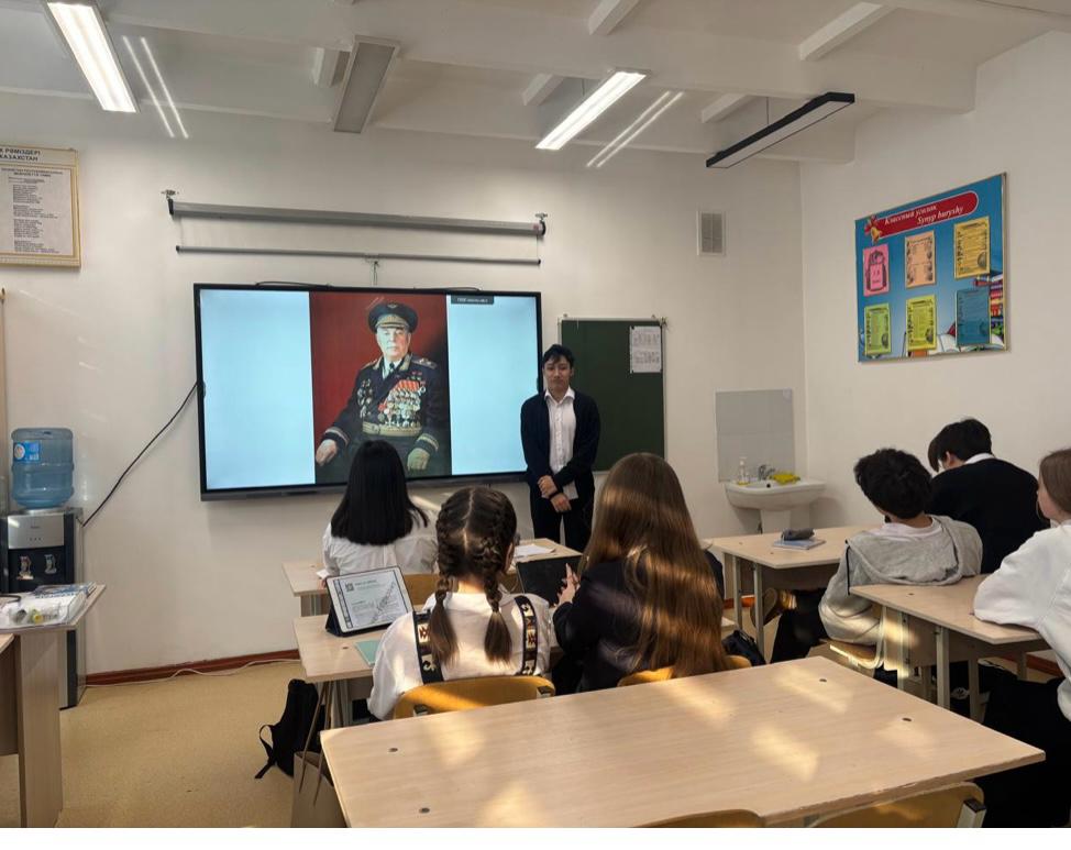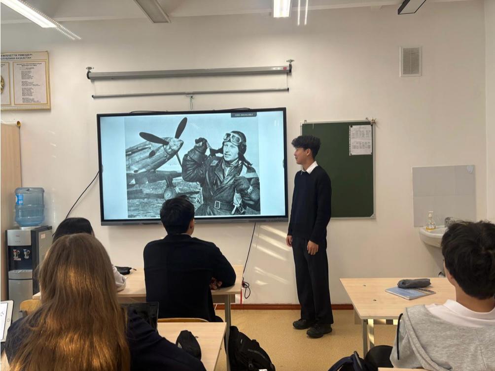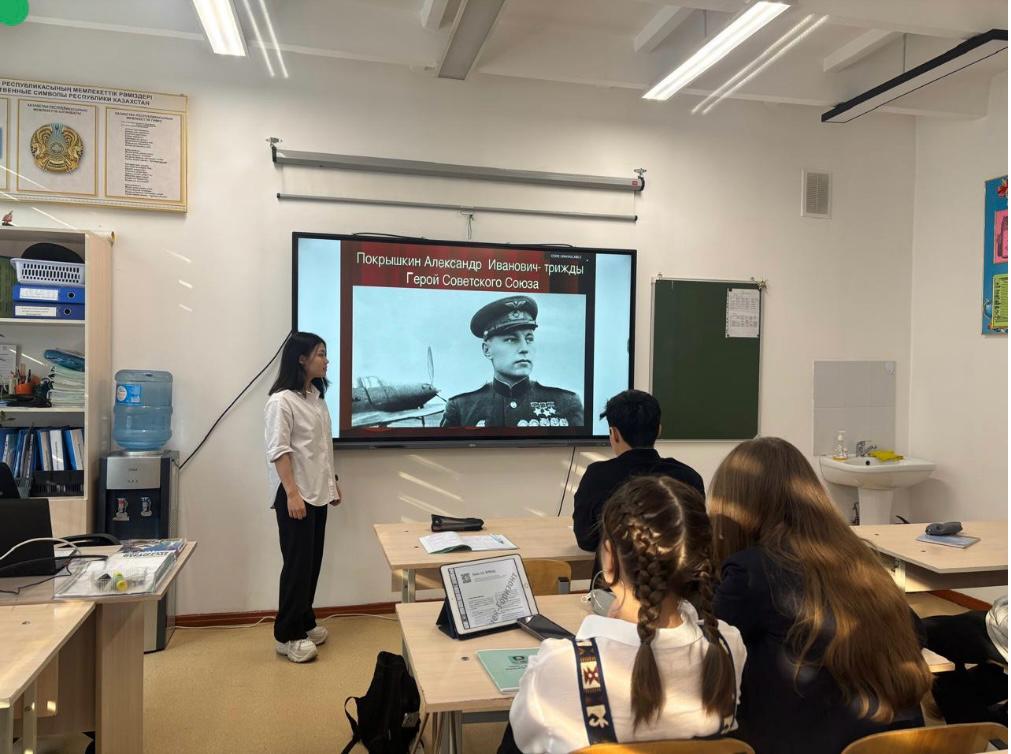 «Екінші дүниежүзілік соғыстың маңызды күндері» жобасы аясында тарих пәнінің мұғалімі Алиева Г.А. 10”А” сынып оқушыларымен үш мәрте Кеңес Одағының Батыры Александр Покрышкин туралы әңгіме өткізді.