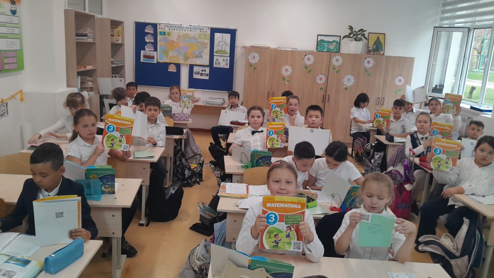 "№18 Гимназия " КММ оқушыларына қатысты қорқыту фактілеріне қарсы іс-қимыл және құқыққа қарсы іс-қимыл бойынша жұмыс жүргізу үшін мектеп оқулықтарында прокуратураның QR кодтары орналастырылған