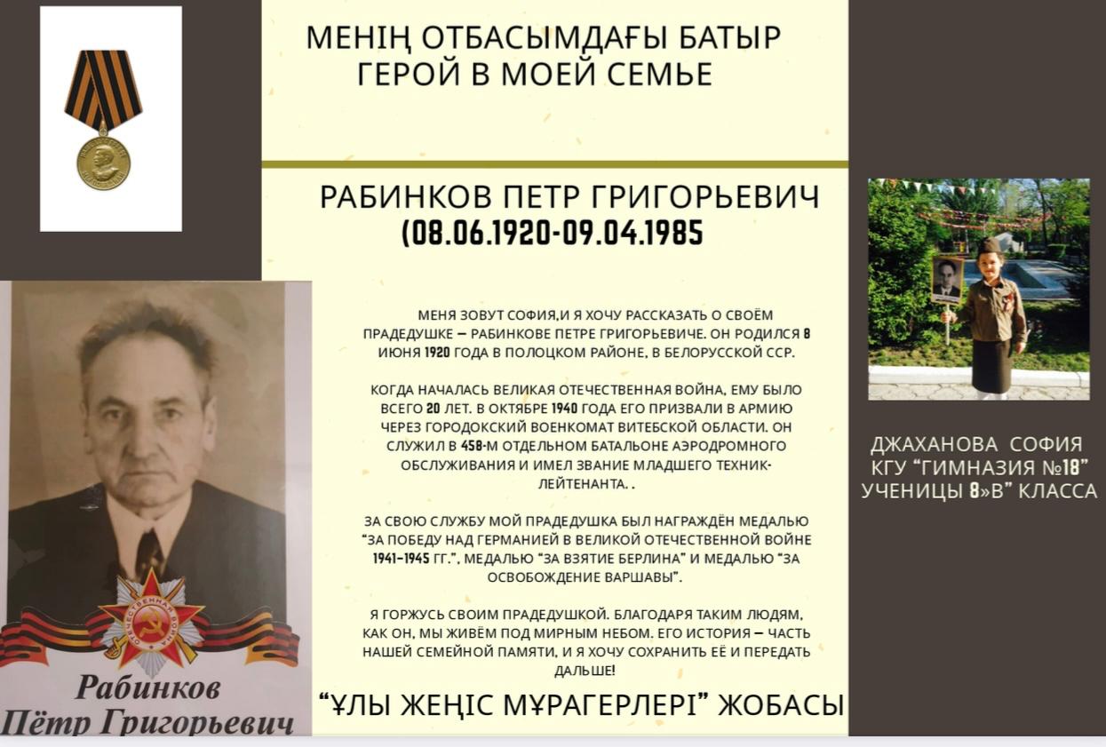 Жеңістің 80 жылдығы қарсаңында 8 «В» сынып оқушысы Джаханова София өзінің ардақты атасы — Рабиков Петр Григорьевич туралы үлкен мақтанышпен айтып берді. Ұлы Отан соғысы басталған кезде оған небәрі 20 жас еді. Жас болса да, ол ерлік пен батылдық танытып, «1941-1945 жж. Ұлы Отан соғысында Германияны жеңгені үшін» медалімен, «Берлинді алғаны үшін» медалімен және «Варшаваны азат еткені үшін» медалімен марапатталған. София өз атасымен өте қатты мақтанады, өйткені дәл осындай жандардың арқасында біз бүгін бейбіт аспан астында өмір сүріп жатырмыз. Оның тарихы — отбасылық жадтың бір бөлігі!