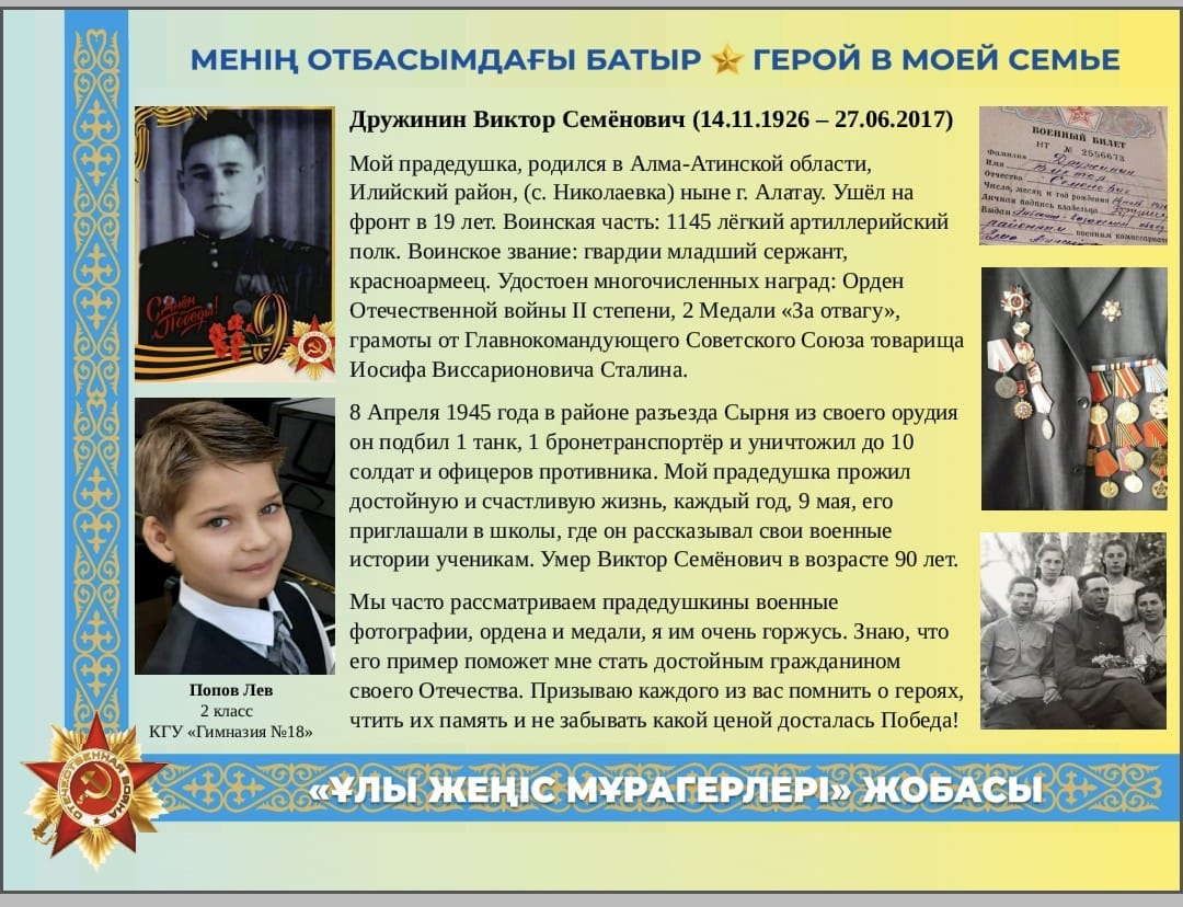Ұлы Жеңістің 80 жылдығын мерекелеу қарсаңында 2д сынып оқушысы Попов Лев өзінің 19 жасында майданға шақырылған ұлы атасы Дружинин Виктор Семеновичтің жауынгерлік жеңістері туралы айтты. Виктор Семенович көптеген ордендермен және медальдармен марапатталды: Отан соғысы ІІ дәрежесі ордені," двумяігі үшін "Екі медалі, сондай-ақ Кеңес Одағының Бас Қолбасшысы Жолдас Иосиф Виссарионович Сталиннің грамоталары. Виктор Семеновичтің балалары мен немерелері оны мақтан тұтады, барлық істерінде оған еліктеуге, еліміздің лайықты азаматтары болуға тырысады