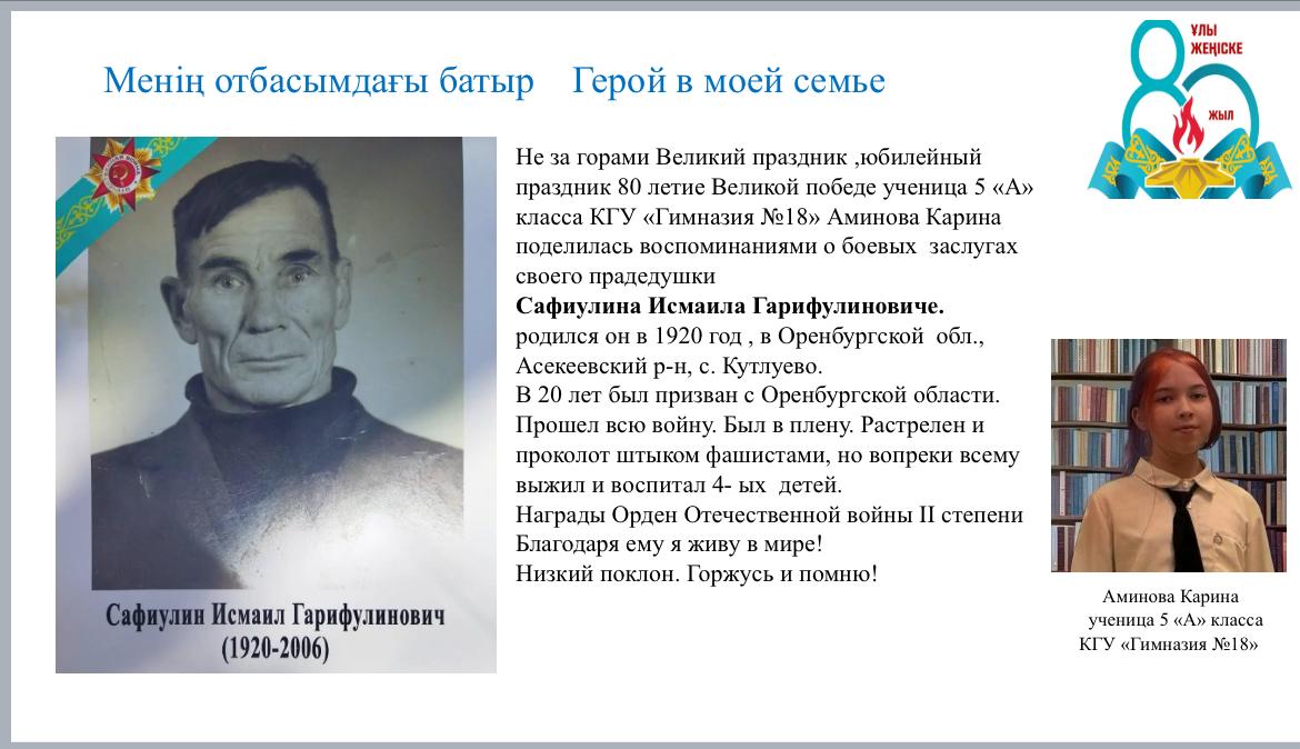Не за горами Великий праздник, юбилейный праздник 80 летие Великой победе ученица 5 «А» класса КГУ «Гимназия №18» Аминова Карина поделилась воспоминаниями о боевых заслугах своего прадедушки Сафиулина Исмаила Гарифулиновиче. Родился он в 1920 год, в Оренбургской обл., Асекеевский р-н, с. Кутлуево. В 20 лет был призван с Оренбургской области. Прошел всю войну. Был в плену. Растрелен и проколот штыком фашистами, но вопреки всему выжил и воспитал 4- ых детей. Награды Орден Отечественной войны II степени. Благодаря ему я живу в мире! Низкий поклон. Горжусь и помню!