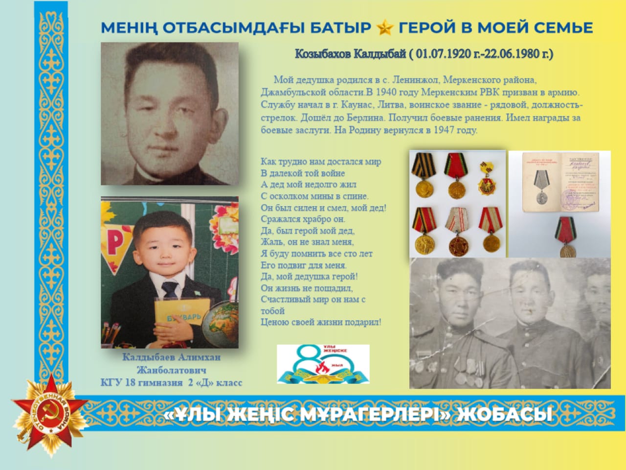 В предверии празднования 80-летия Великой Победы ученик 2Д класса Калдыбаев Алимхан рассказал о боевых победах своего прадедушки Козыбахове Калдыбае, который в свои 20лет был призван в армию и прошел до Берлина. Имеет много боевых наград и медалей. Дети и внуки ветерана помнят своего прадедушку и гордятся его заслугами перед Родиной, а также стараются быть достойными гражданами нашей страны