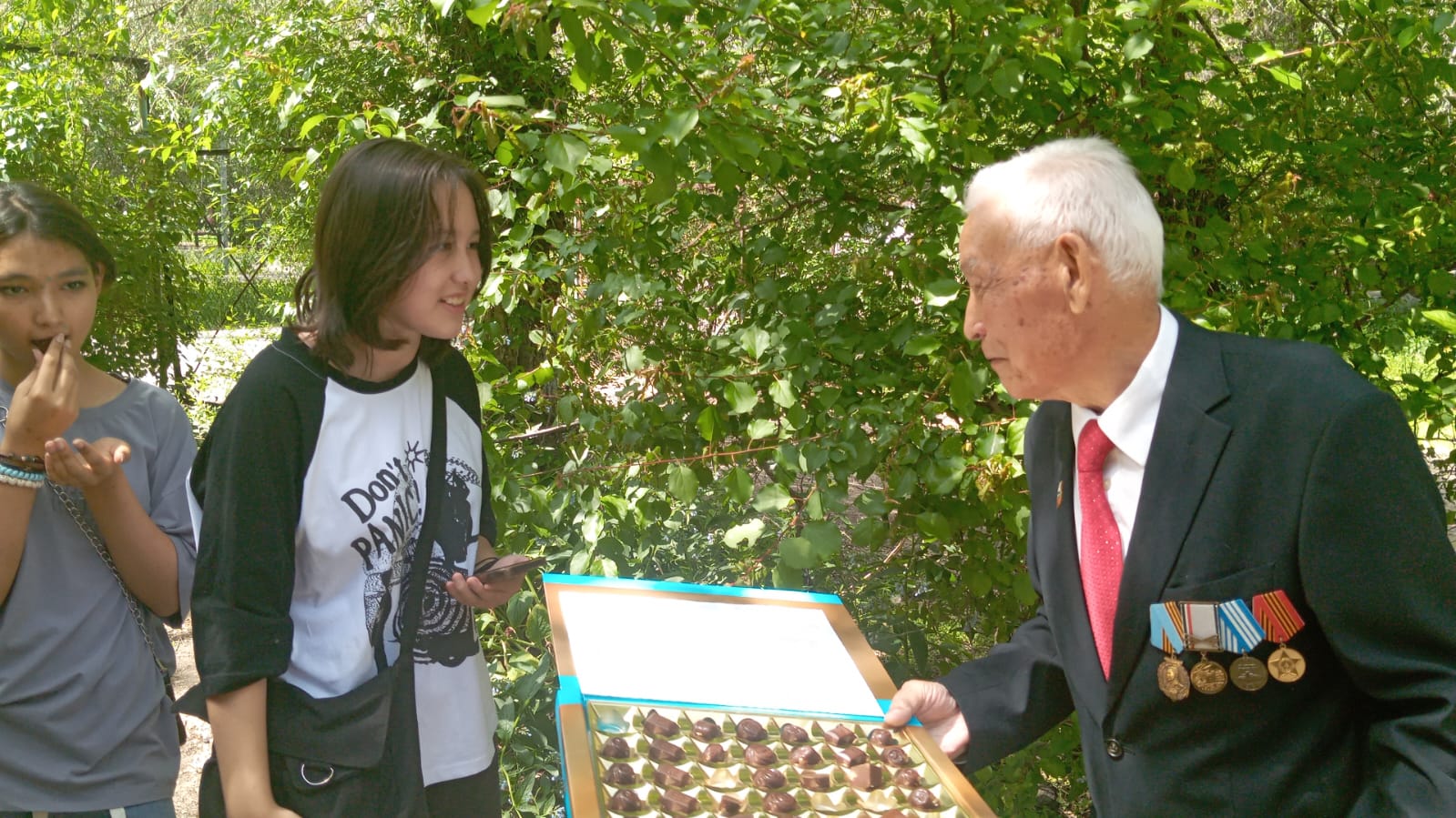 Жеңістің 80 жылдығы қарсаңында 8-«Б» сынып оқушылары Ұлы Отан соғысы ардагерлеріне теңестірілген Садыков Тельманмен кездесті.