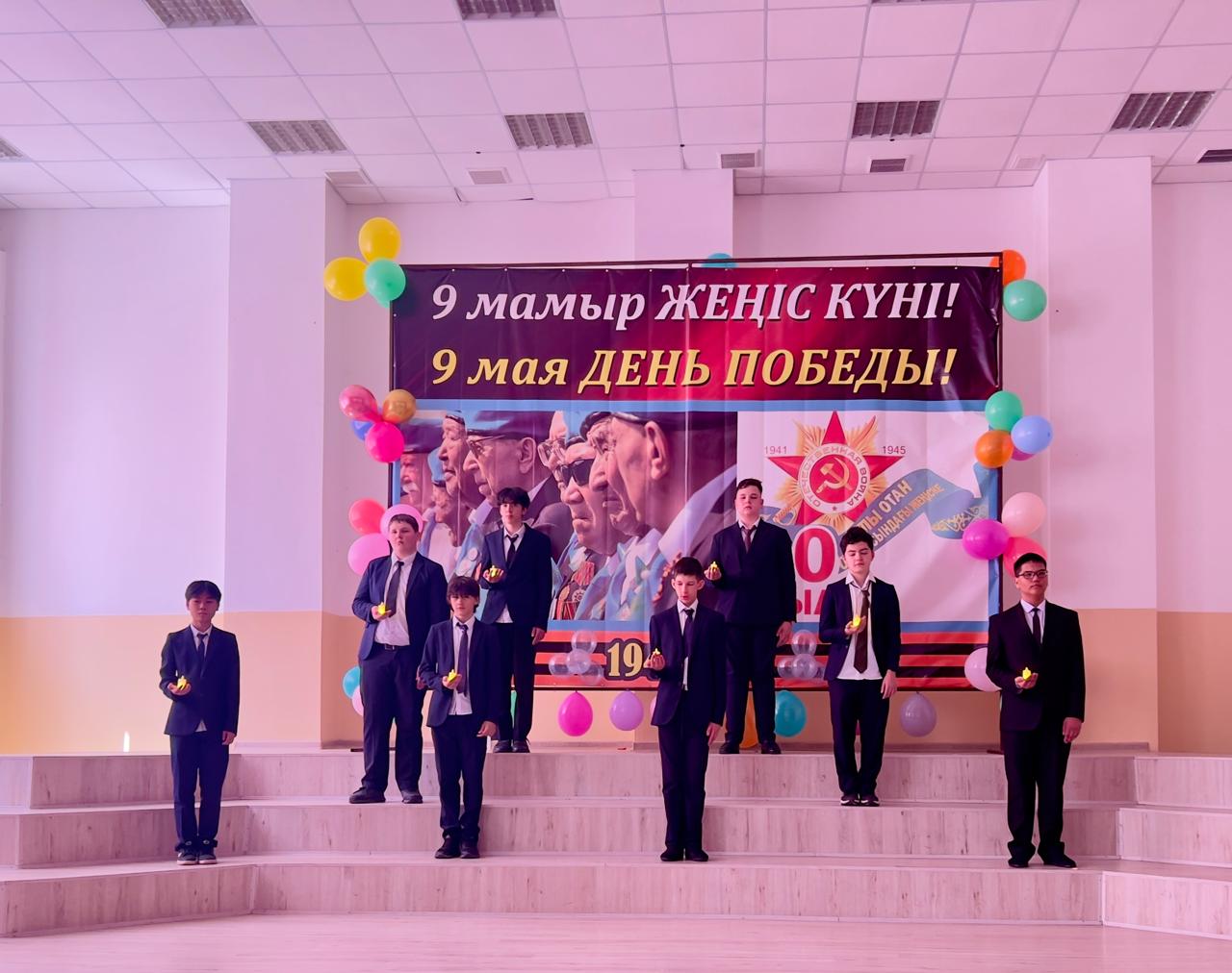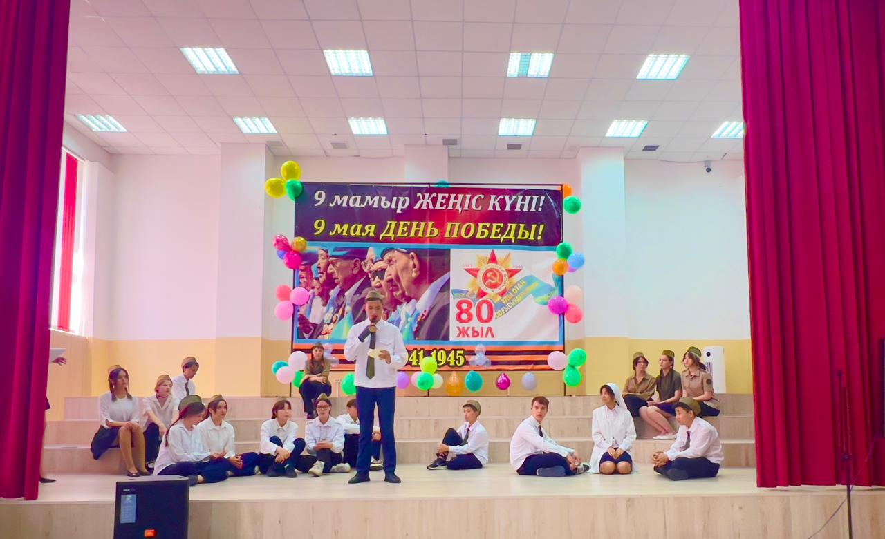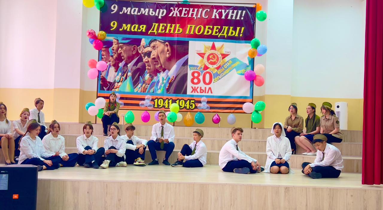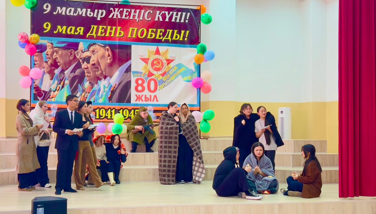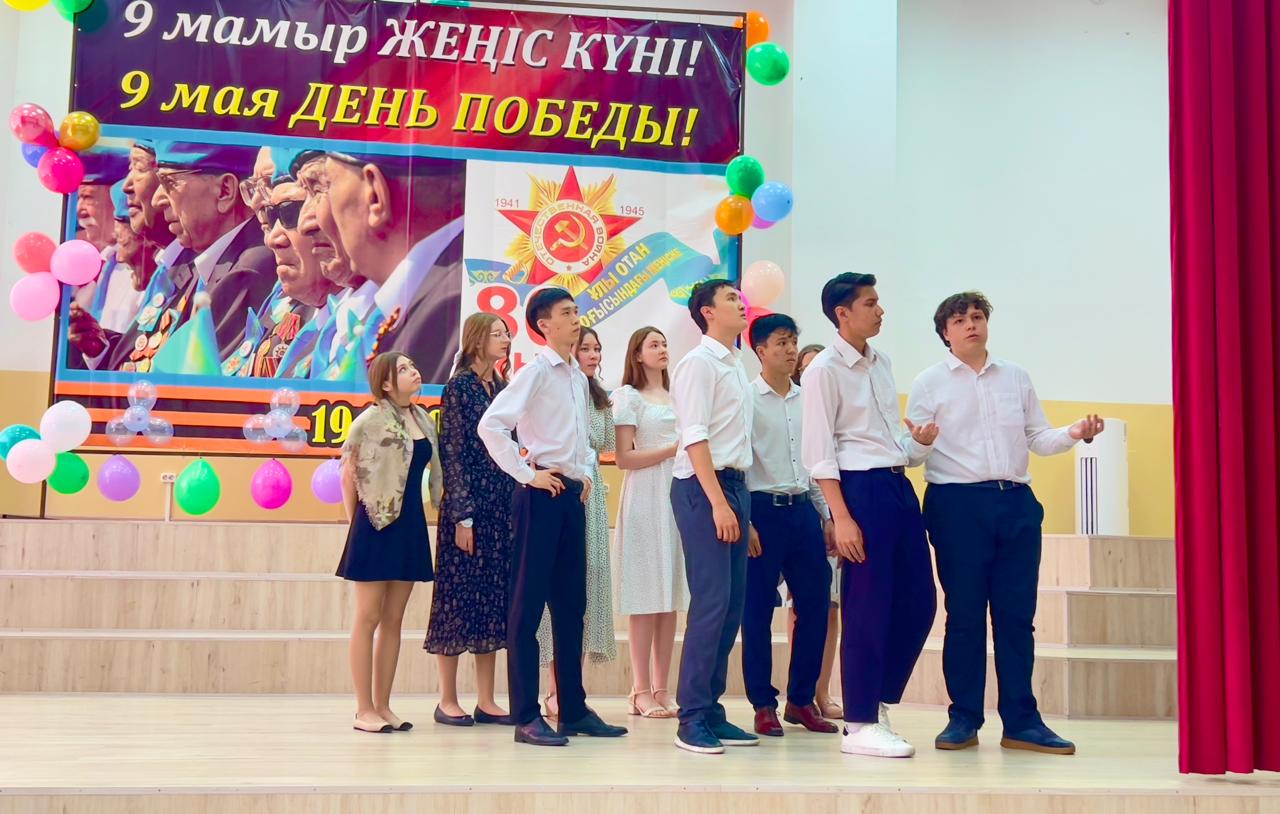 Гимназия директоры Наурызбаева Гульджамиля Каратаевна жиналғандарды Жеңіс мерекесімен құттықтап, баршаға зор денсаулық, бейбіт өмір, амандық және бізге азаттық сыйлаған жандарға жарқын естелік тіледі! Салтанатты құттықтаудан кейін көрермендер 1941–1945 жылдардағы соғыс жылдарының атмосферасына енді. Сахнада қоштасу белгісіндей болып, түлектер жеңіл вальс биледі. Бірінен кейін бірі көрермендердің көңілін толқытқан сахналар өтті: ана ұлын майданға шығарып салды, еріктілер алғы шепке аттанды, сарбаздар демалыс сәттерін өткізді. Алия Молдағұлованың ерлікпен қаза тапқаны жайлы қайғылы хабар сахнада айтылған сәт ерекше әсерлі болды. Сондай-ақ жас пионер-қаһармандардың ерлігі де назардан тыс қалмады. Блокадалық Ленинградтағы өмір көріністері мен «Ленинградтықтар, балаларым менің!» атты өлеңнің оқылуы көптеген көрермендердің жанарына жас үйірді. Көрермендер залында Ұлы Отан соғысында қаза тапқандарды бір минут үнсіздікпен еске алды. Іс-шара «Ұлы соғыс ардагерлеріне» және «Жеңіс күні» әндерінің орындалуымен аяқталып, көрермендердің ыстық ықыласына, шапалақ пен алғыс көз жасына бөленді. Бұл кеш халық ерлігіне деген құрмет, мақтаныш пен естеліктерге толы әсерлі әрі жарқын аяқталды!