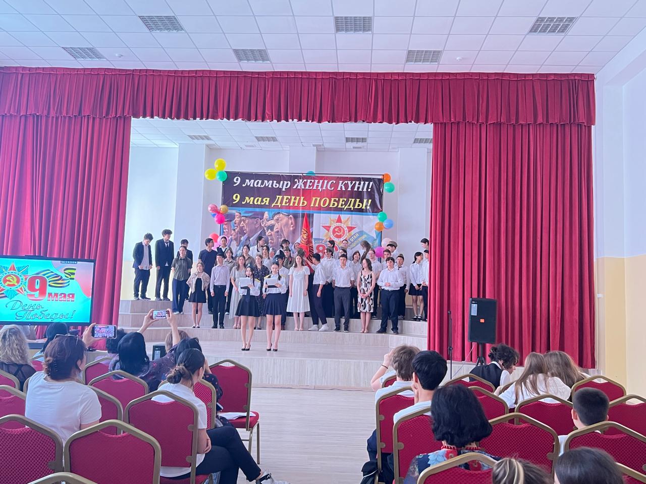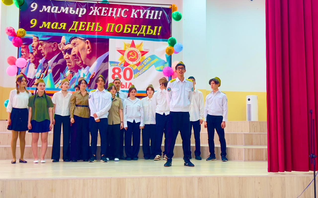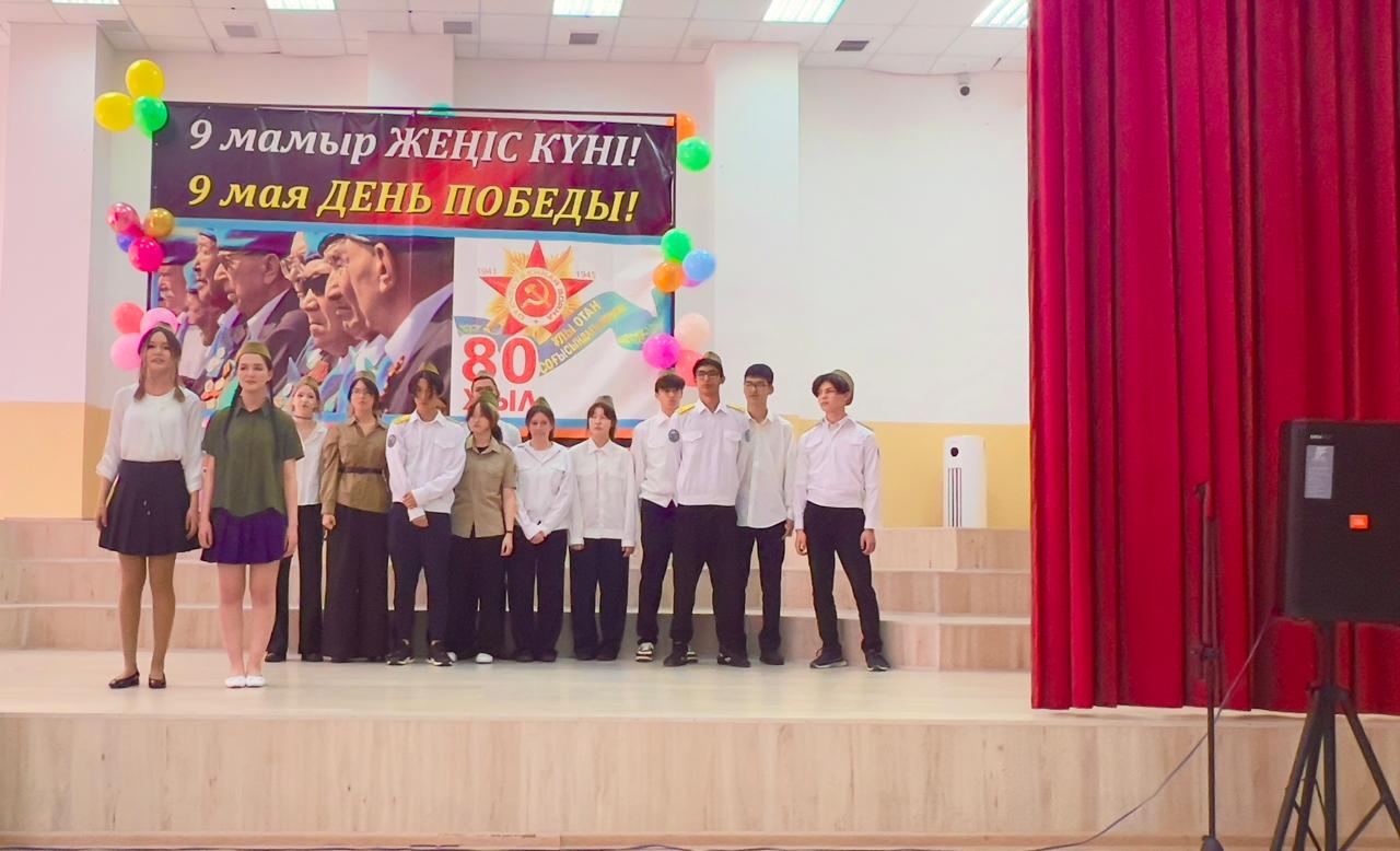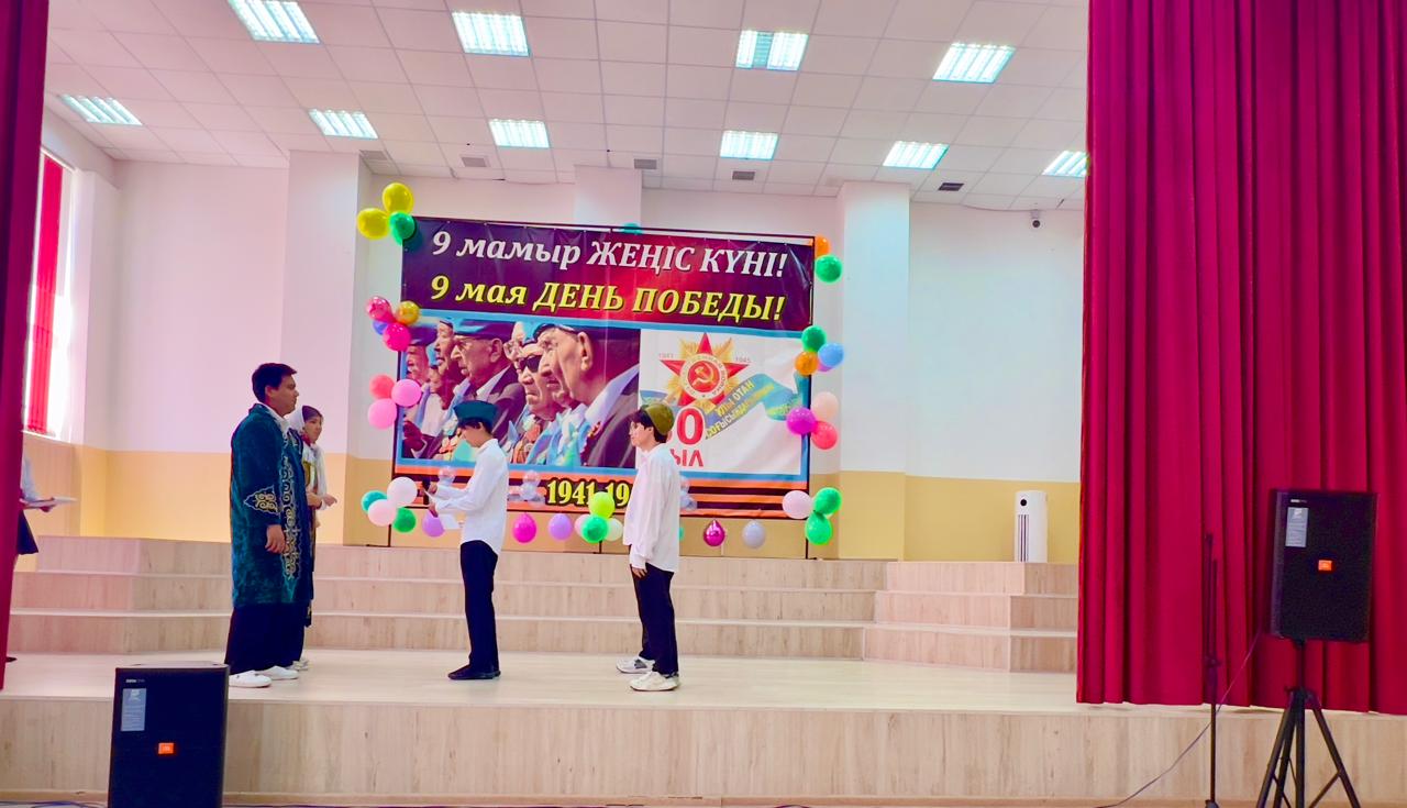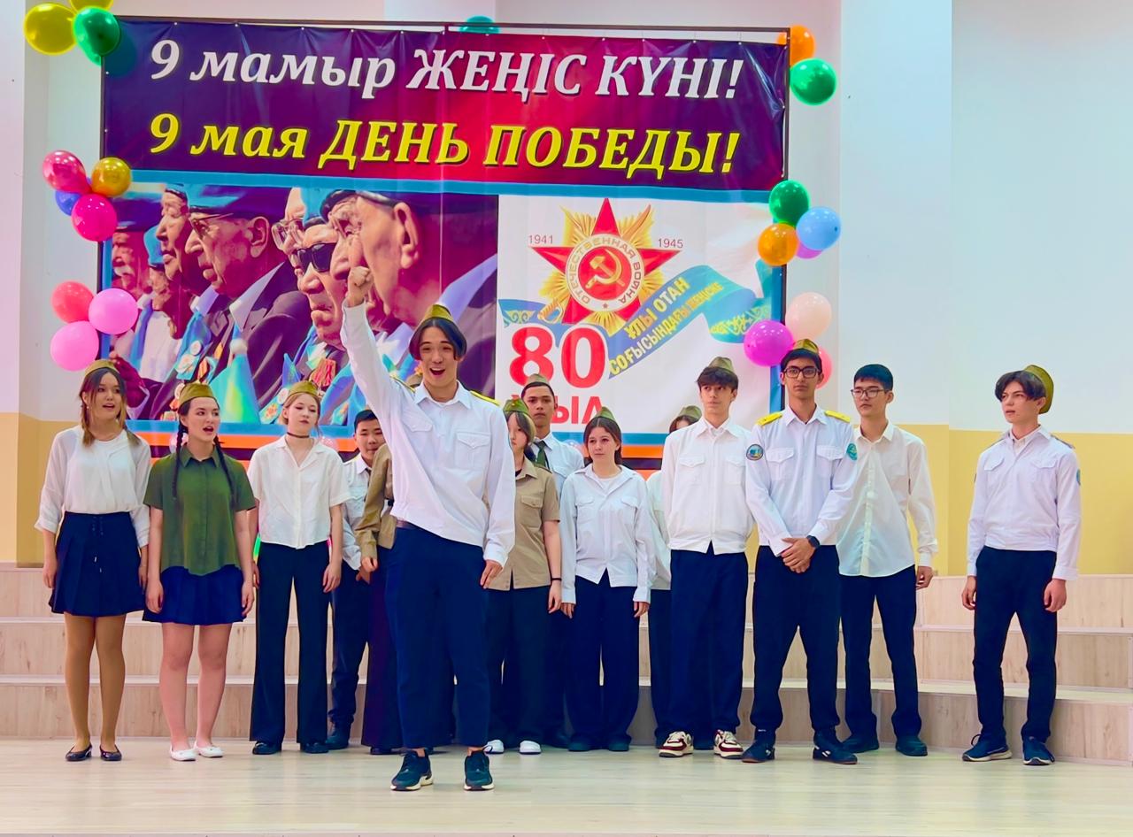 Гимназия директоры Наурызбаева Гульджамиля Каратаевна жиналғандарды Жеңіс мерекесімен құттықтап, баршаға зор денсаулық, бейбіт өмір, амандық және бізге азаттық сыйлаған жандарға жарқын естелік тіледі! Салтанатты құттықтаудан кейін көрермендер 1941–1945 жылдардағы соғыс жылдарының атмосферасына енді. Сахнада қоштасу белгісіндей болып, түлектер жеңіл вальс биледі. Бірінен кейін бірі көрермендердің көңілін толқытқан сахналар өтті: ана ұлын майданға шығарып салды, еріктілер алғы шепке аттанды, сарбаздар демалыс сәттерін өткізді. Алия Молдағұлованың ерлікпен қаза тапқаны жайлы қайғылы хабар сахнада айтылған сәт ерекше әсерлі болды. Сондай-ақ жас пионер-қаһармандардың ерлігі де назардан тыс қалмады. Блокадалық Ленинградтағы өмір көріністері мен «Ленинградтықтар, балаларым менің!» атты өлеңнің оқылуы көптеген көрермендердің жанарына жас үйірді. Көрермендер залында Ұлы Отан соғысында қаза тапқандарды бір минут үнсіздікпен еске алды. Іс-шара «Ұлы соғыс ардагерлеріне» және «Жеңіс күні» әндерінің орындалуымен аяқталып, көрермендердің ыстық ықыласына, шапалақ пен алғыс көз жасына бөленді. Бұл кеш халық ерлігіне деген құрмет, мақтаныш пен естеліктерге толы әсерлі әрі жарқын аяқталды!