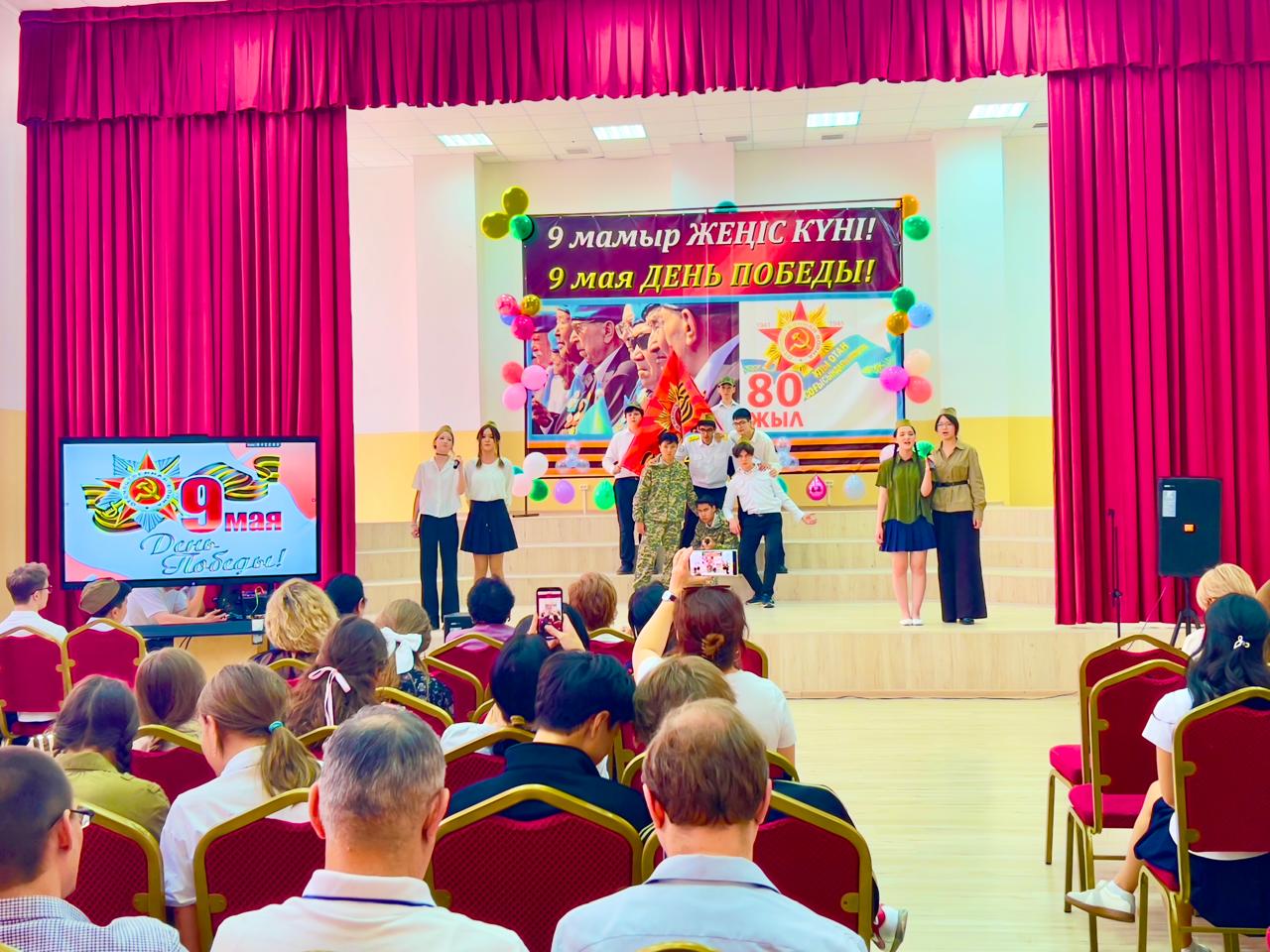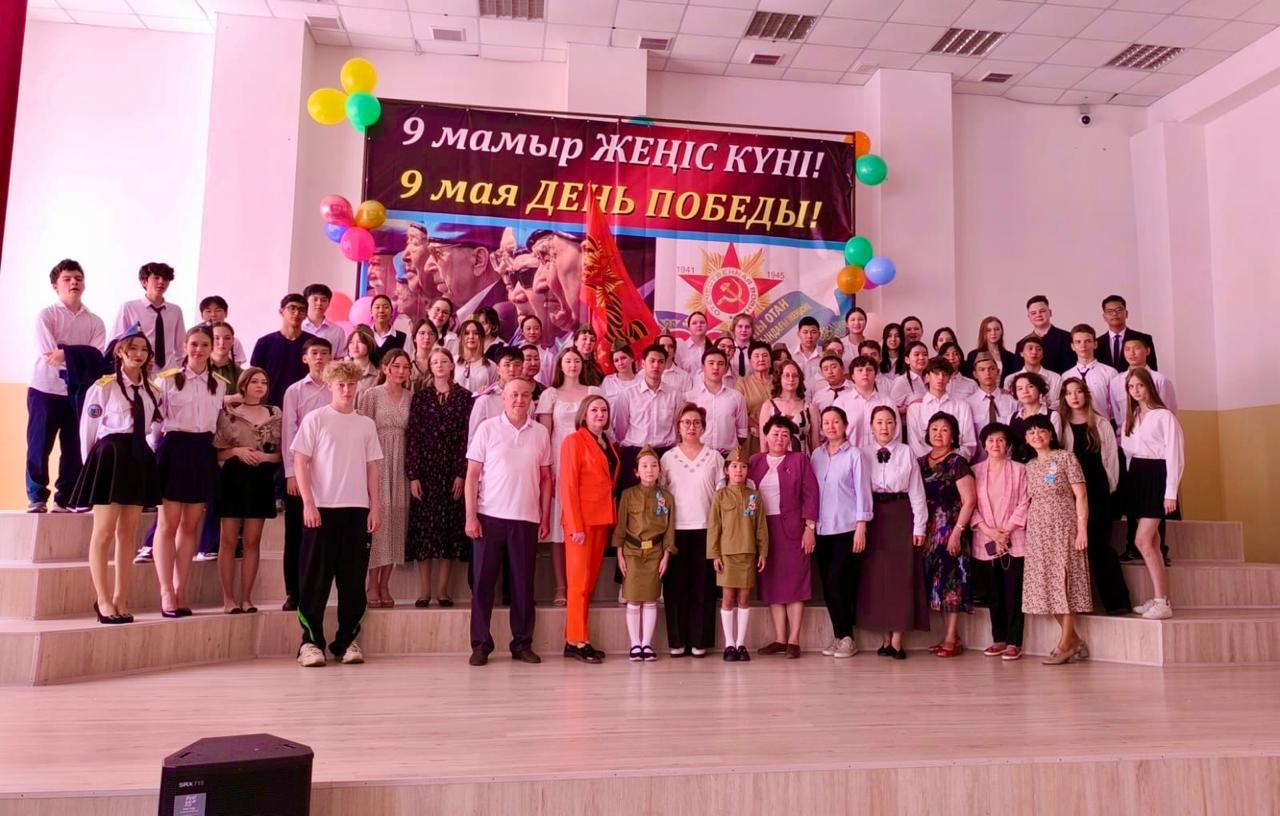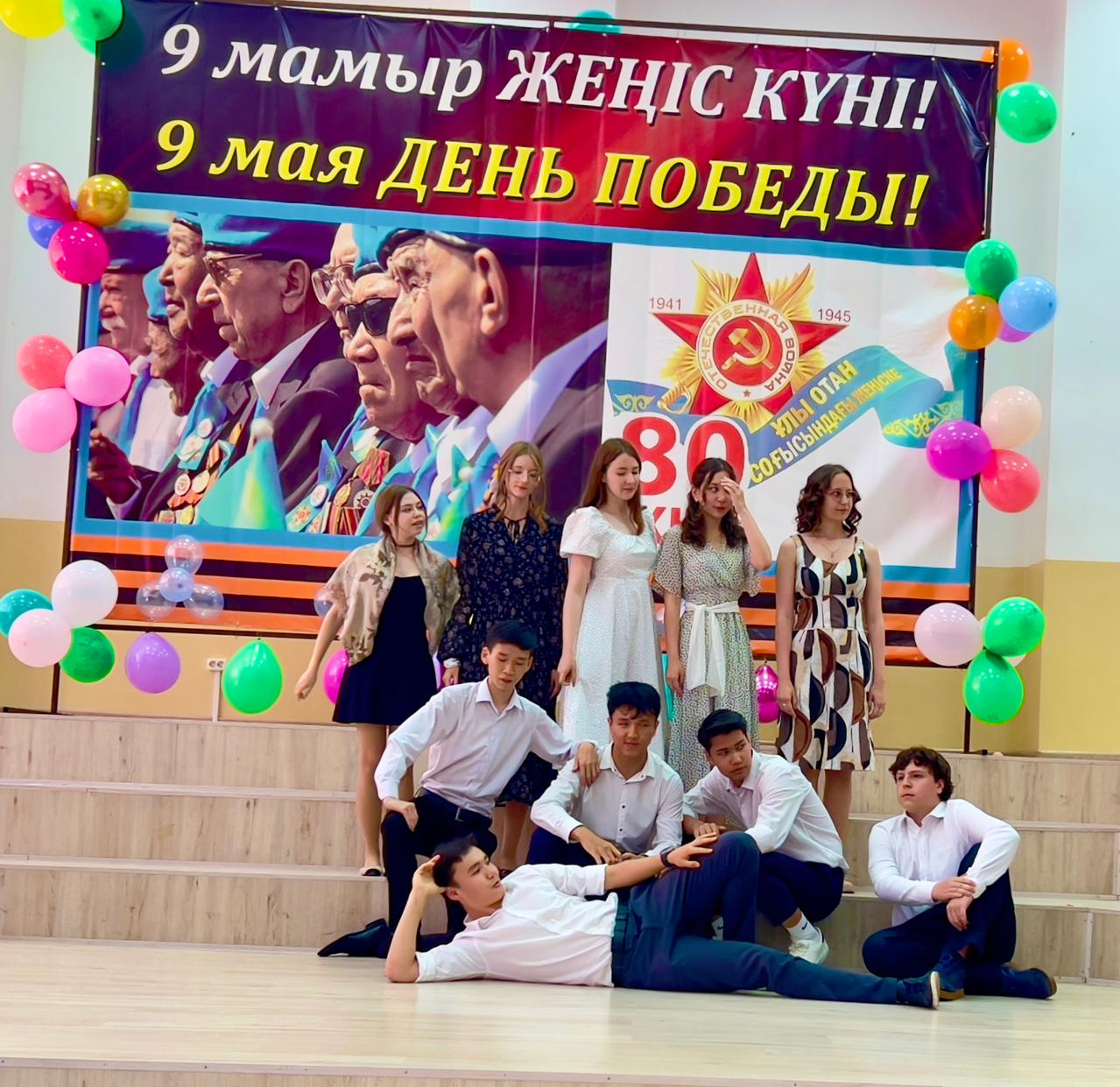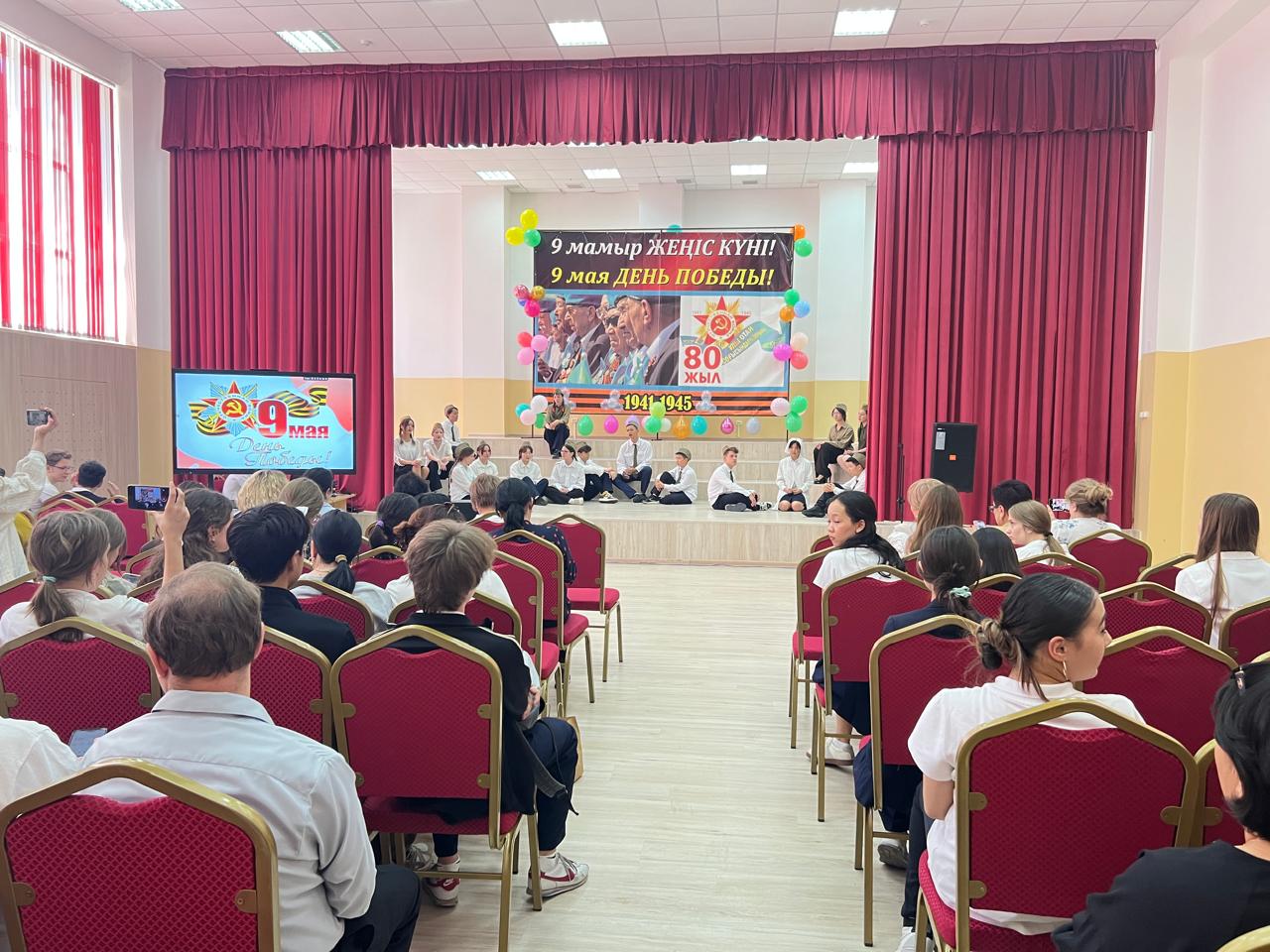 Гимназия директоры Наурызбаева Гульджамиля Каратаевна жиналғандарды Жеңіс мерекесімен құттықтап, баршаға зор денсаулық, бейбіт өмір, амандық және бізге азаттық сыйлаған жандарға жарқын естелік тіледі! Салтанатты құттықтаудан кейін көрермендер 1941–1945 жылдардағы соғыс жылдарының атмосферасына енді. Сахнада қоштасу белгісіндей болып, түлектер жеңіл вальс биледі. Бірінен кейін бірі көрермендердің көңілін толқытқан сахналар өтті: ана ұлын майданға шығарып салды, еріктілер алғы шепке аттанды, сарбаздар демалыс сәттерін өткізді. Алия Молдағұлованың ерлікпен қаза тапқаны жайлы қайғылы хабар сахнада айтылған сәт ерекше әсерлі болды. Сондай-ақ жас пионер-қаһармандардың ерлігі де назардан тыс қалмады. Блокадалық Ленинградтағы өмір көріністері мен «Ленинградтықтар, балаларым менің!» атты өлеңнің оқылуы көптеген көрермендердің жанарына жас үйірді. Көрермендер залында Ұлы Отан соғысында қаза тапқандарды бір минут үнсіздікпен еске алды. Іс-шара «Ұлы соғыс ардагерлеріне» және «Жеңіс күні» әндерінің орындалуымен аяқталып, көрермендердің ыстық ықыласына, шапалақ пен алғыс көз жасына бөленді. Бұл кеш халық ерлігіне деген құрмет, мақтаныш пен естеліктерге толы әсерлі әрі жарқын аяқталды!