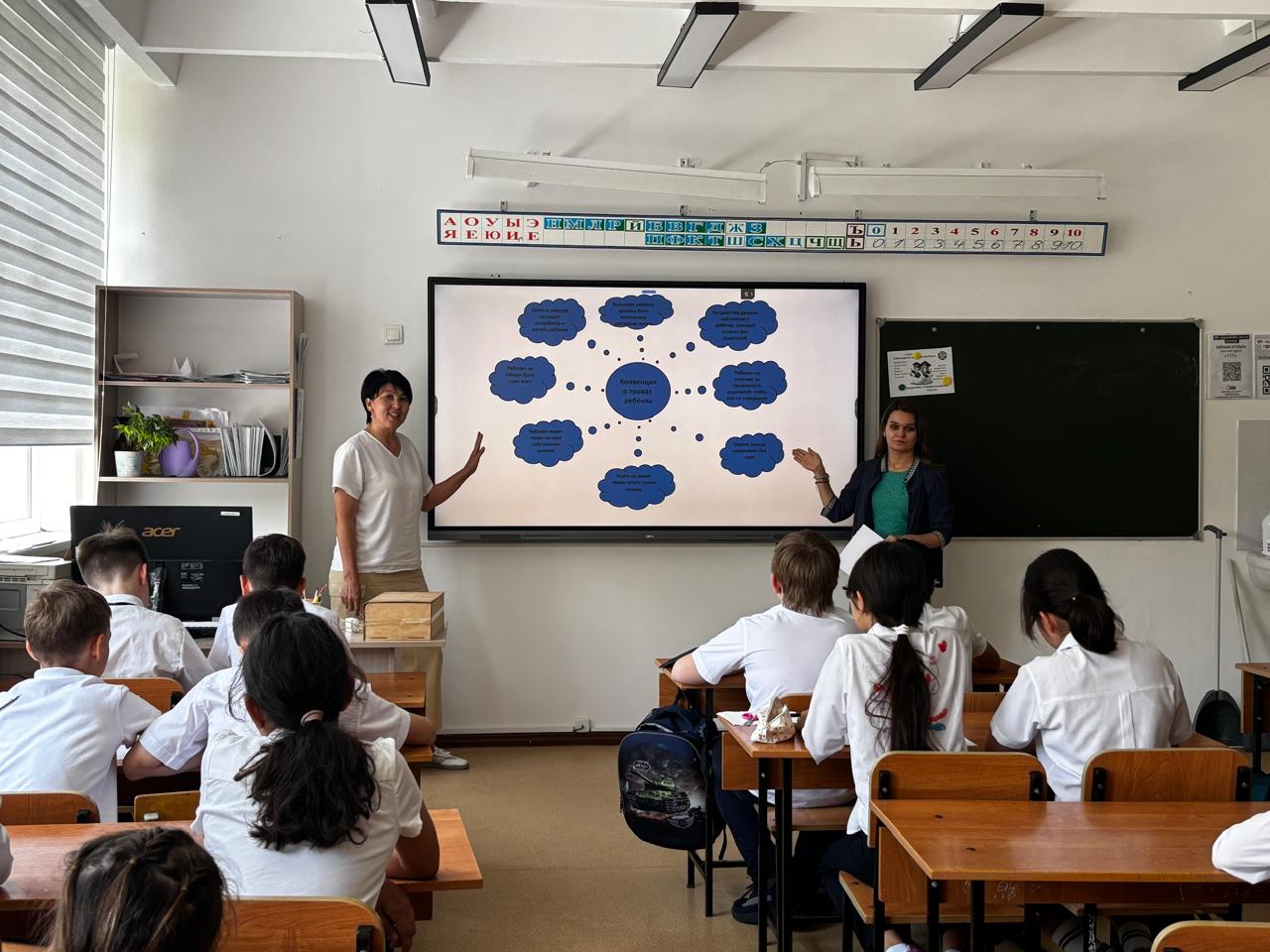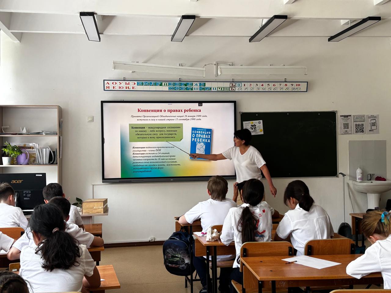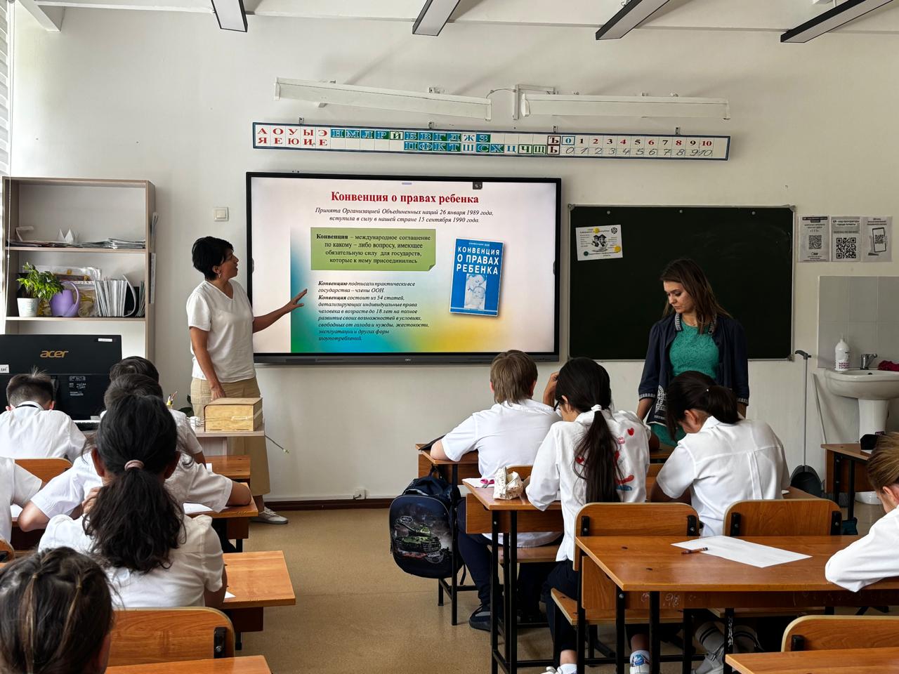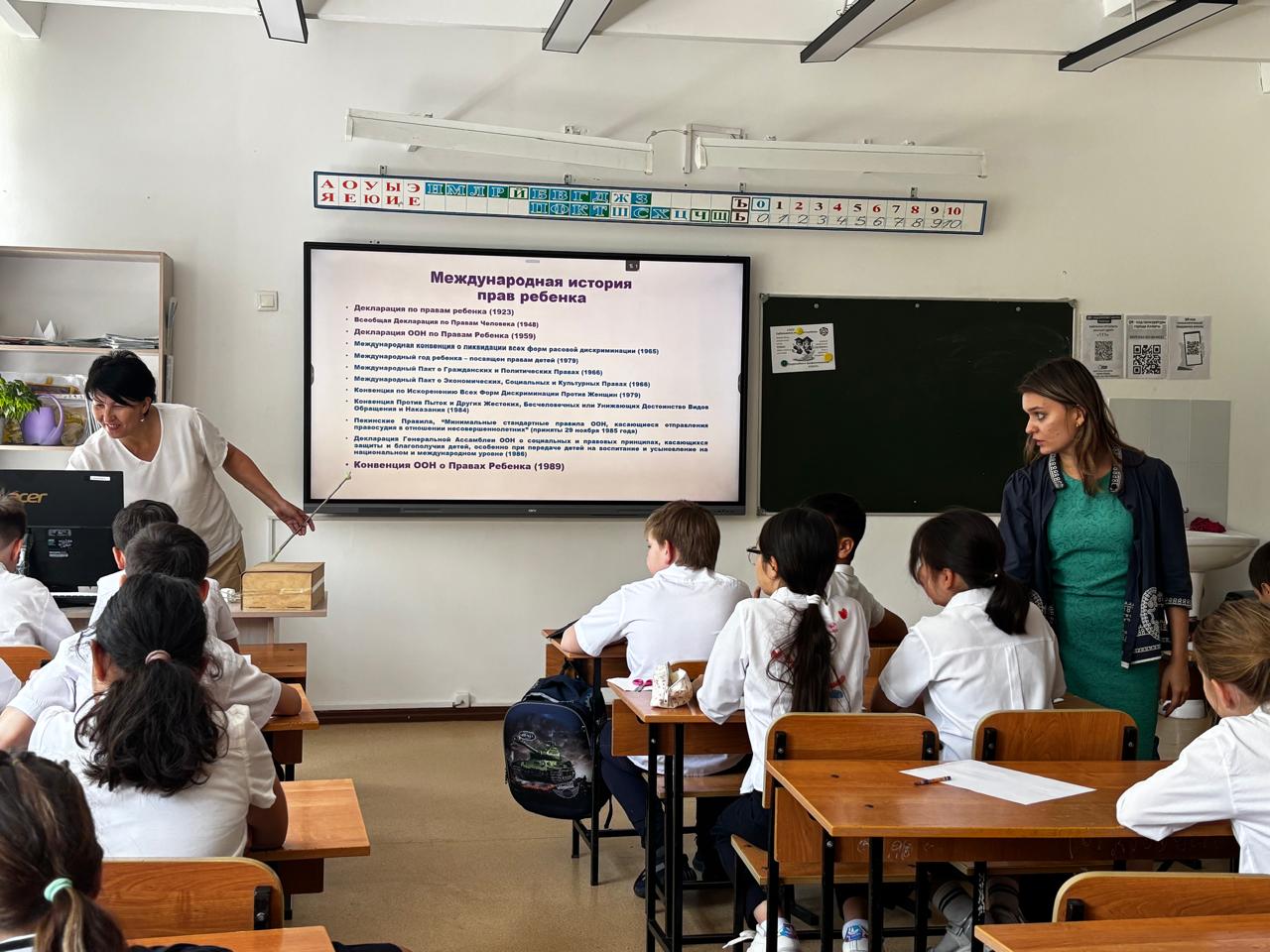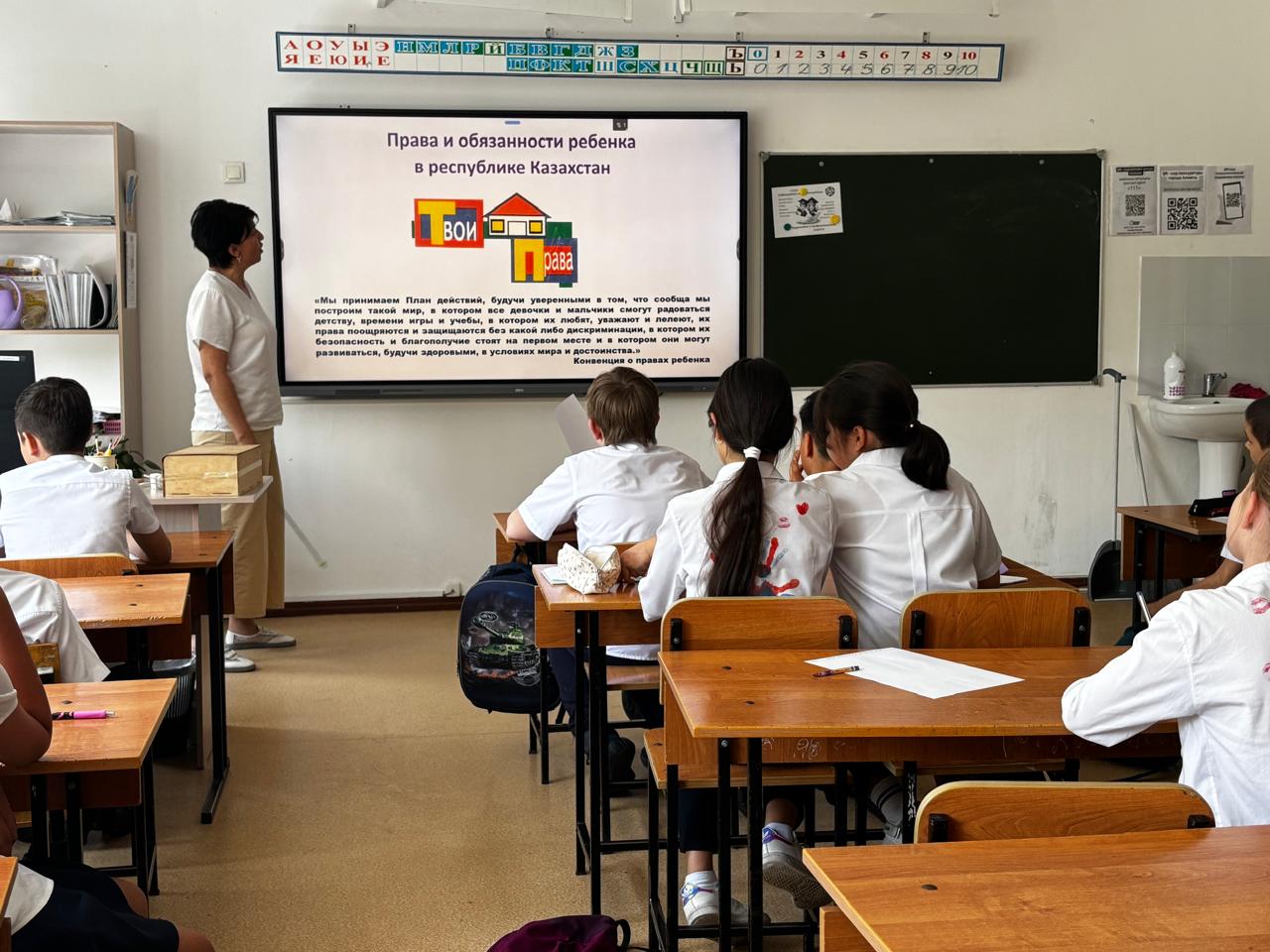 "№18 Гимназия "КММ-де Бастауыш сынып мұғалімдері С. В. Задарожная мен информатика пәнінің мұғалімдері Ж. С. Тәженовамен "Балалардың құқықтары мен міндеттері, ЖҚЕ туралы ақпараттық материал тарату" тақырыбында ақпараттық әңгіме өткізілді. Оқушылар керекті, пайдалы материалдар алды:
