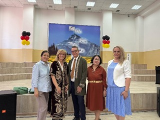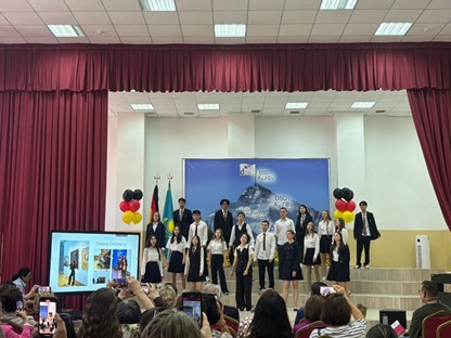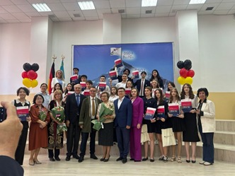 20 мая 2025 года в КГУ «Гимназия №18» состоялось одно из самых волнующих событий в жизни нашей гимназии, самый яркий и торжественный аккорд, которого ждут учащиеся, учителя, родители – вручение международных языковых дипломов уровня В2/С1 по немецкому языку! Церемония вручения проходила в актовом зале школы. С поздравлениями выступила директор школы Наурызбаева Г.К., которая отметила удивительную мотивацию учащихся, веру в перспективность немецкого языка родителей, неиссякаемый энтузиазм преподавателей. И этот уникальный тандем приносит свои плоды. Директор гимназии поблагодарила учителей немецкого языка Симоне Шенфельд, Розу Жакыпову, Эльвиру Кенешеву за отличную подготовку учащихся. На торжественной церемонии присутствовал генеральный консул Федеративной Республики Германия г-н Маттиас Кислер, который сердечно поздравил учащихся, учителей и родителей и вручил дипломы нашим учащимся! Координатор по немецкому языку в РК г-н Марио Шёнфельд сказал, что 16 учащихся гимназии получили Немецкий языковой диплом международного уровня В2/С1! 12 учащихся уже успешно поступили в Штудиенколлеги Германии.