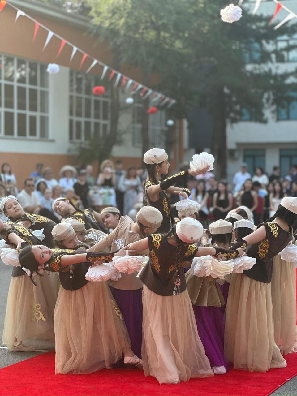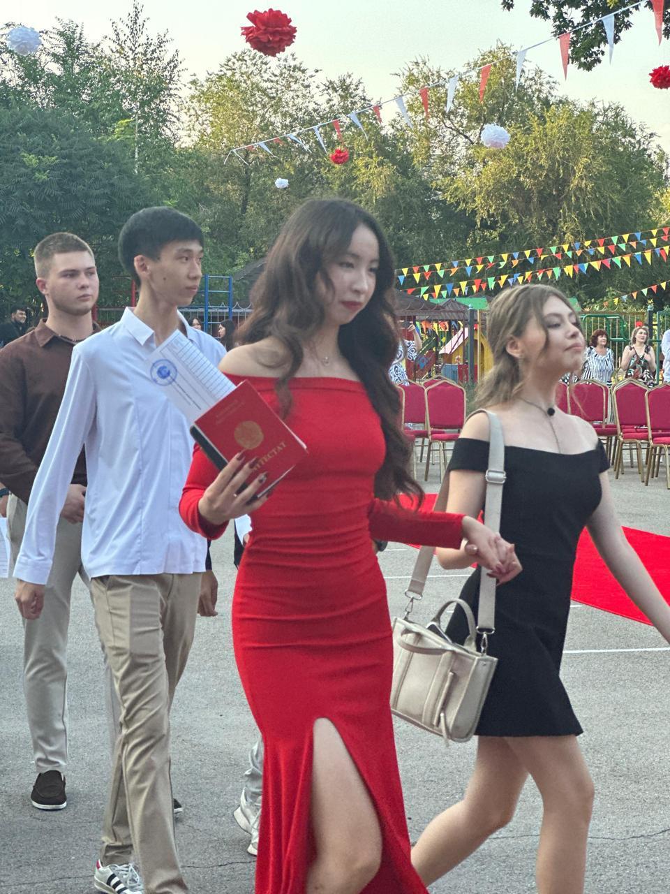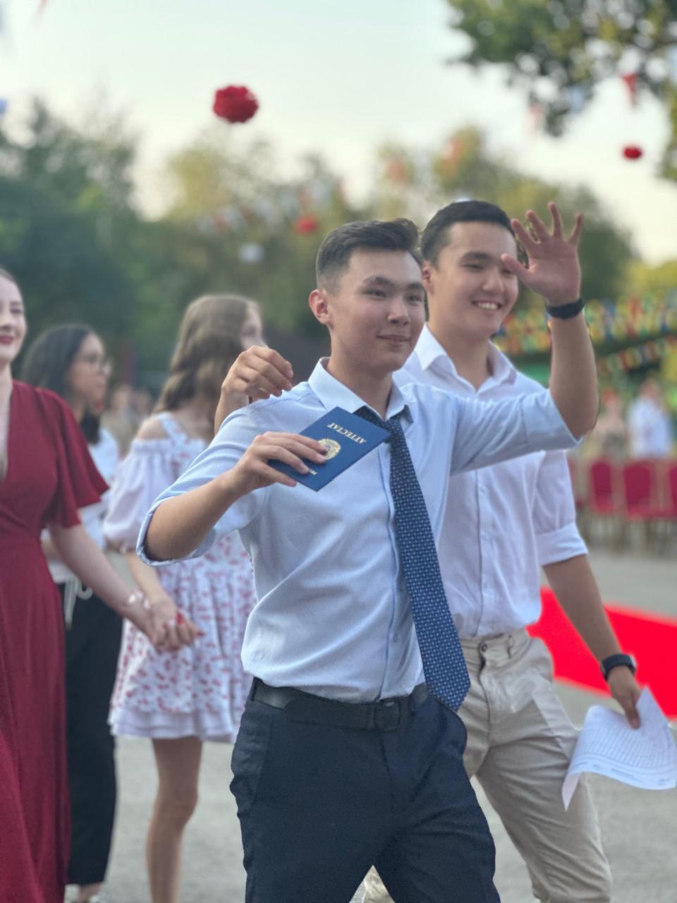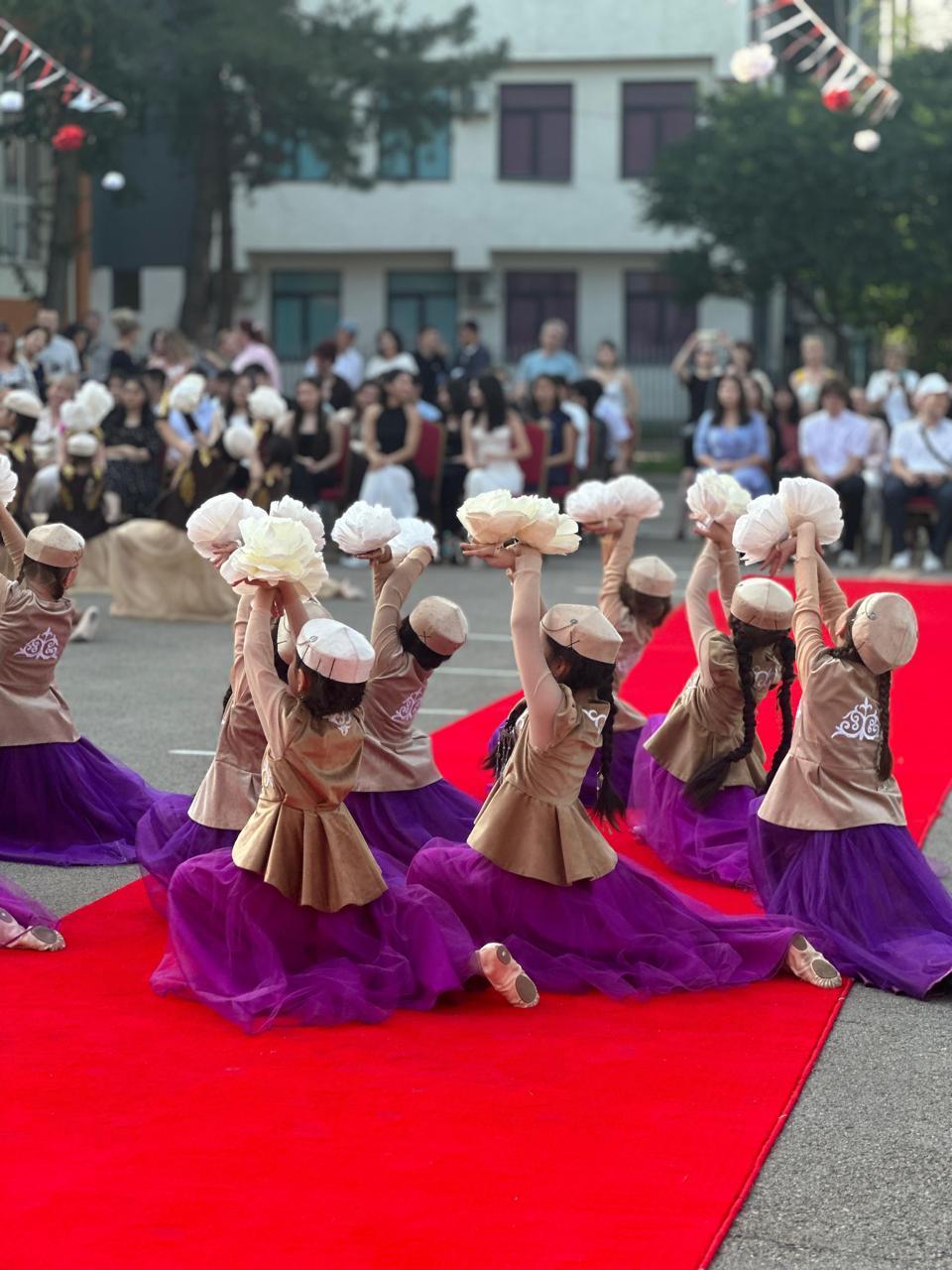 Мұғалімдер, ата-аналар мен қонақтар мерекенің басты кейіпкерлері – түлектерді зор қошеметпен қарсы алды.