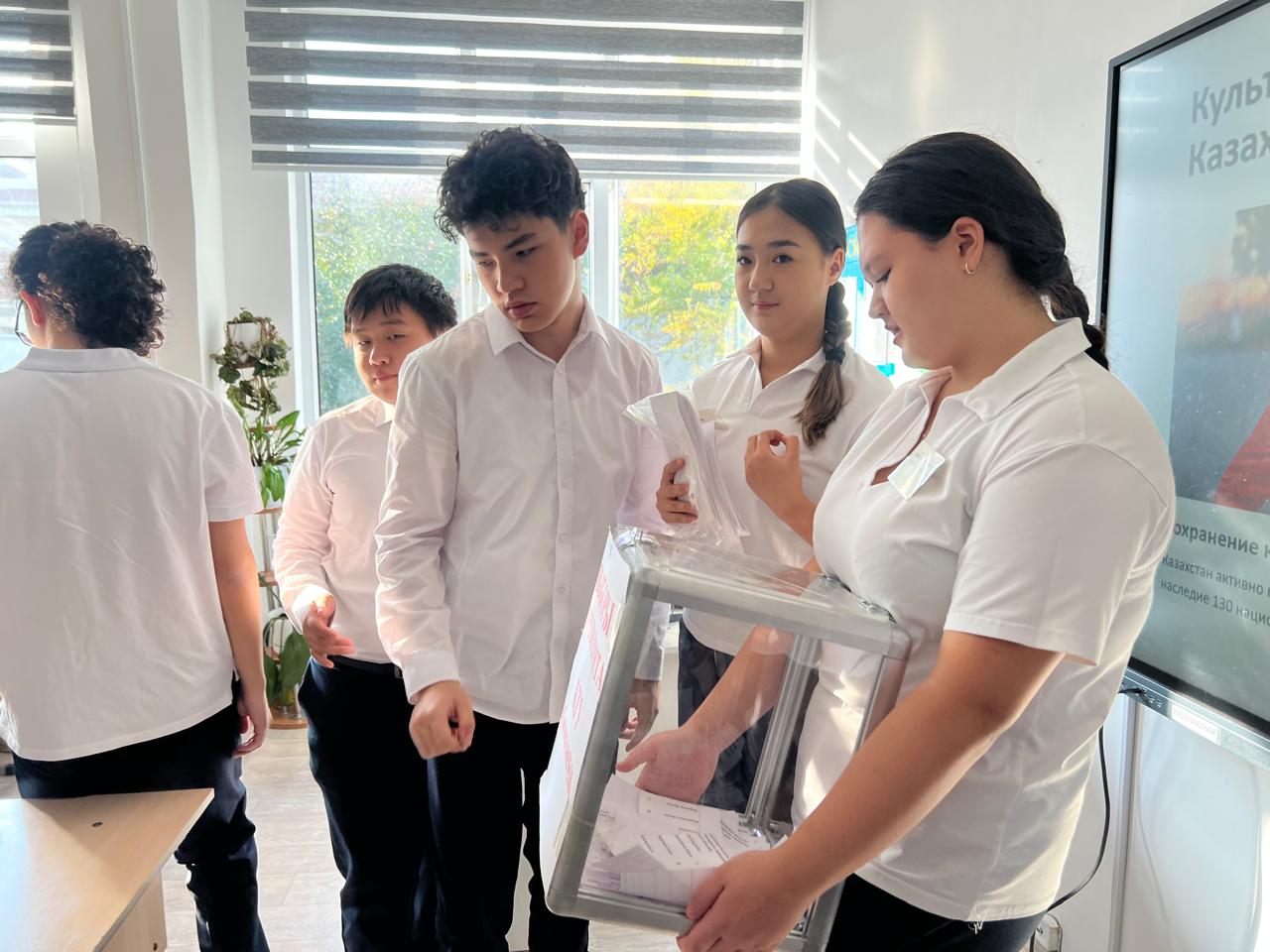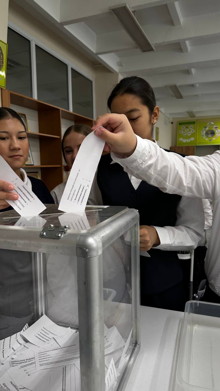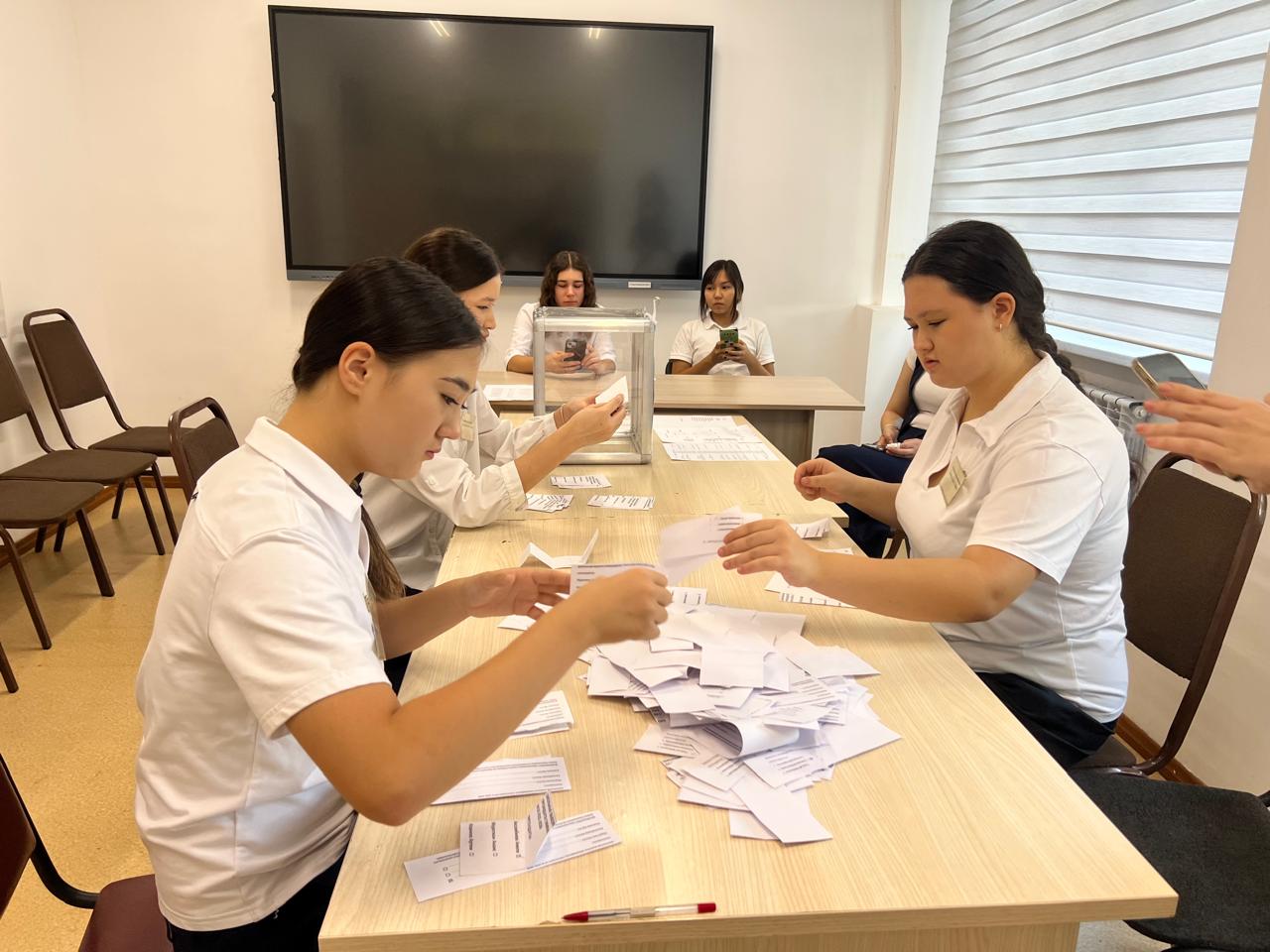 Избирательная комиссия в составе: Джахановой Софии(председатель комиссии),Кежембай Алике,Максутовой Ясмин , совместно с наблюдателями от кандидатов, организованно провела голосование по классам. Каждый ученик имел возможность отдать свой голос за одного из трёх кандидатов.