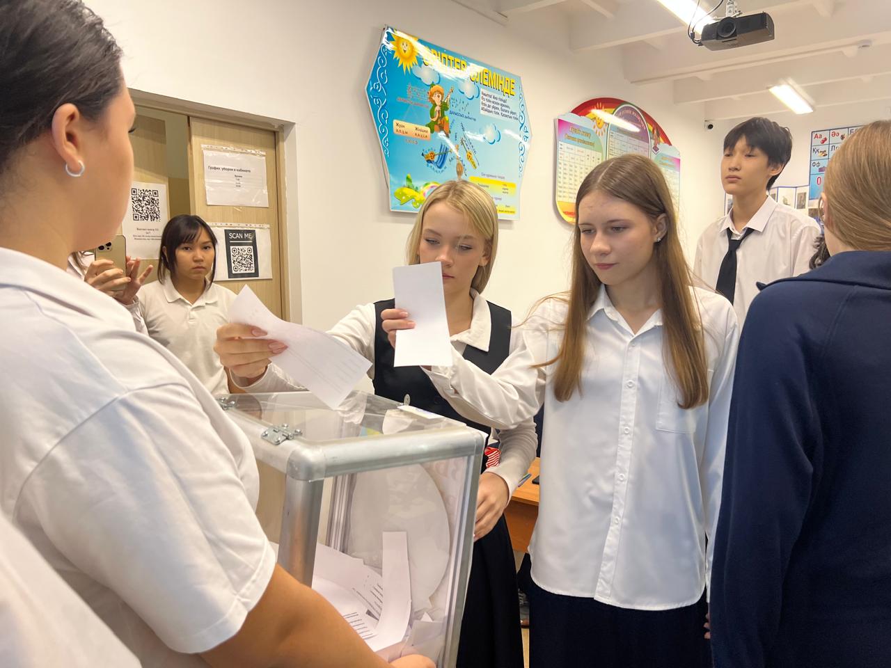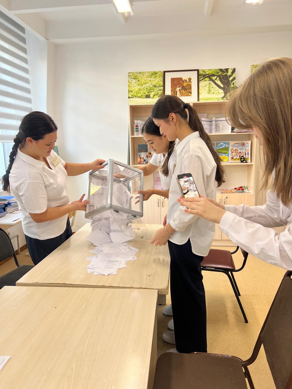 Сайлау комиссиясы құрамында: Джаханова София (комиссия төрайымы), Кежембай Алика, Максутова Ясмин, сонымен қатар кандидаттар тарапынан келген бақылаушылардың қатысуымен дауыс беру сыныптар бойынша ұйымдасқан түрде өткізілді. Әрбір оқушы үш кандидаттың біріне өз дауысын беруге мүмкіндік алды.