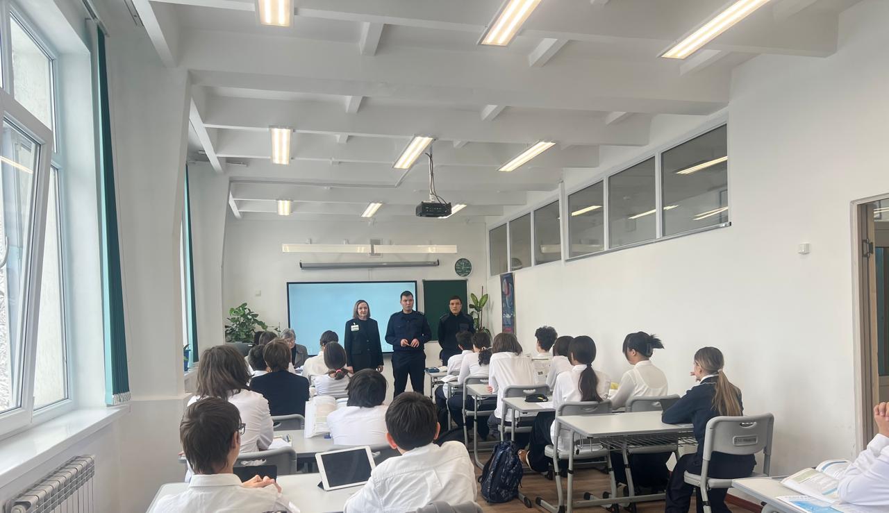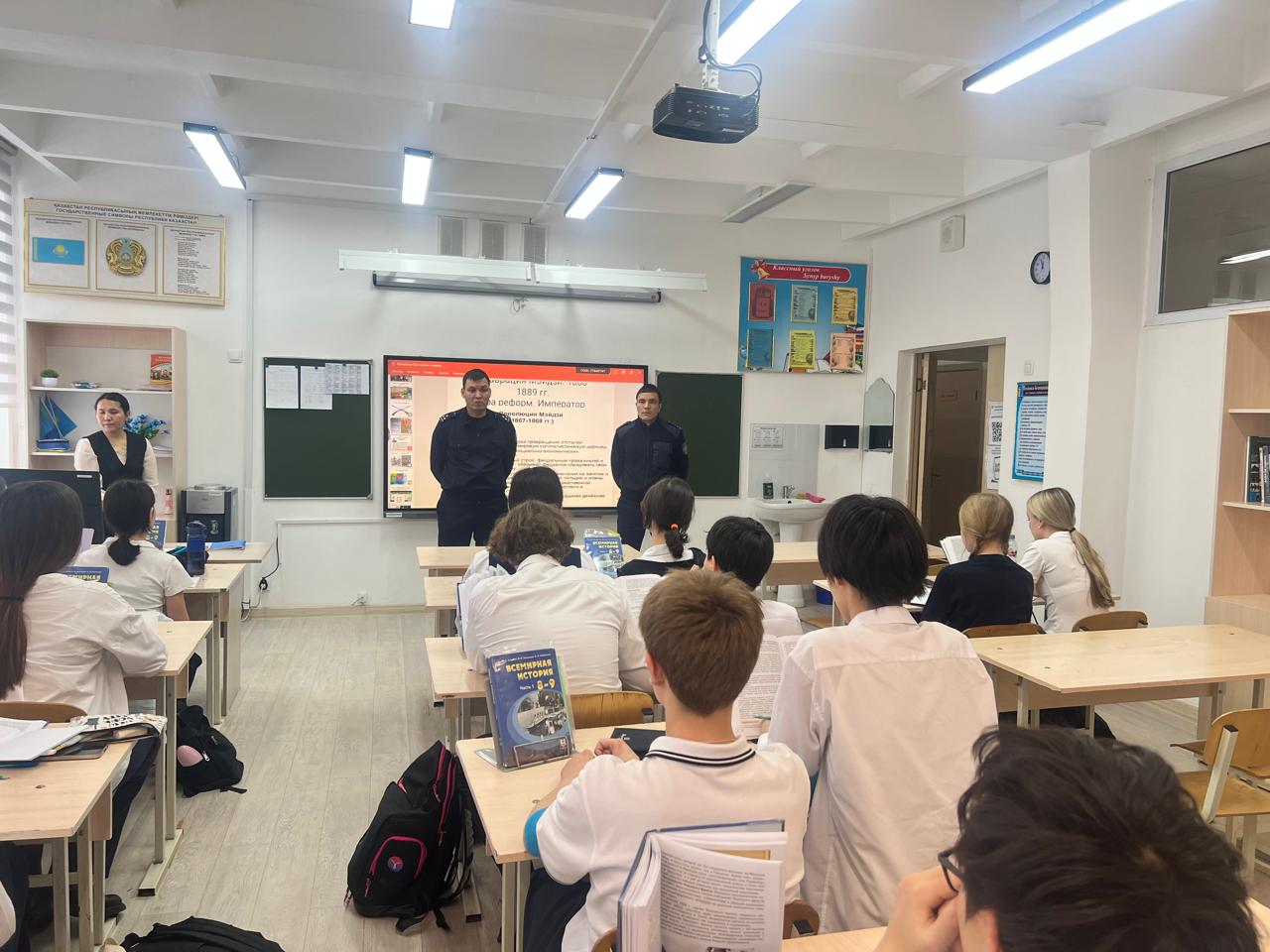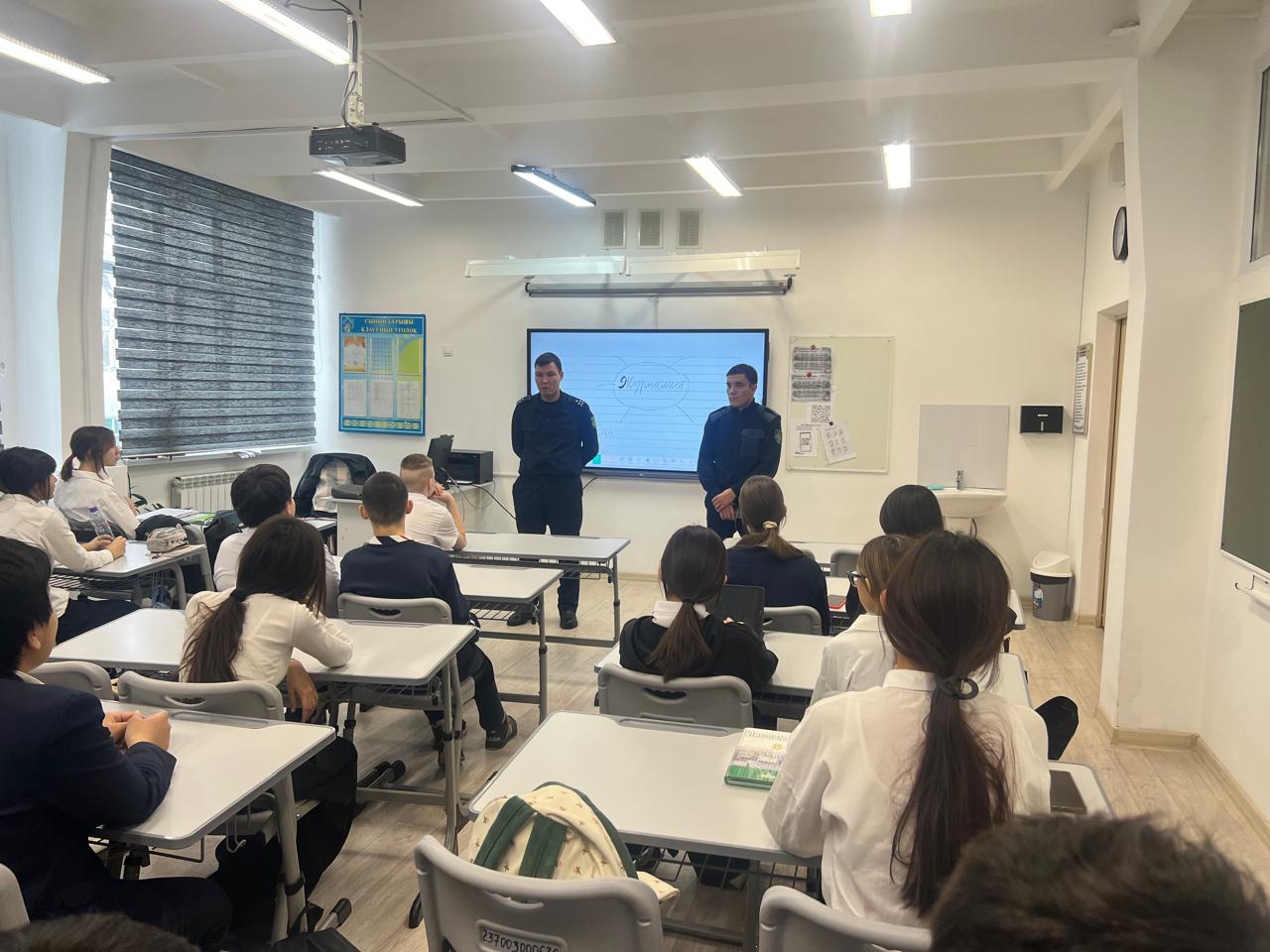 10.12.2025 жылы 8-сынып оқушыларына пиротехникалық бұйымдарды қауіпсіз пайдалану тақырыбында профилактикалық әңгіме өткізілді. Дәрісті Алмалы ауданының УИ ОЮП ОМПС бөлімінің аға лейтенанты Заурбеков А. және полиция капитаны Халидинов Н. жүргізді.