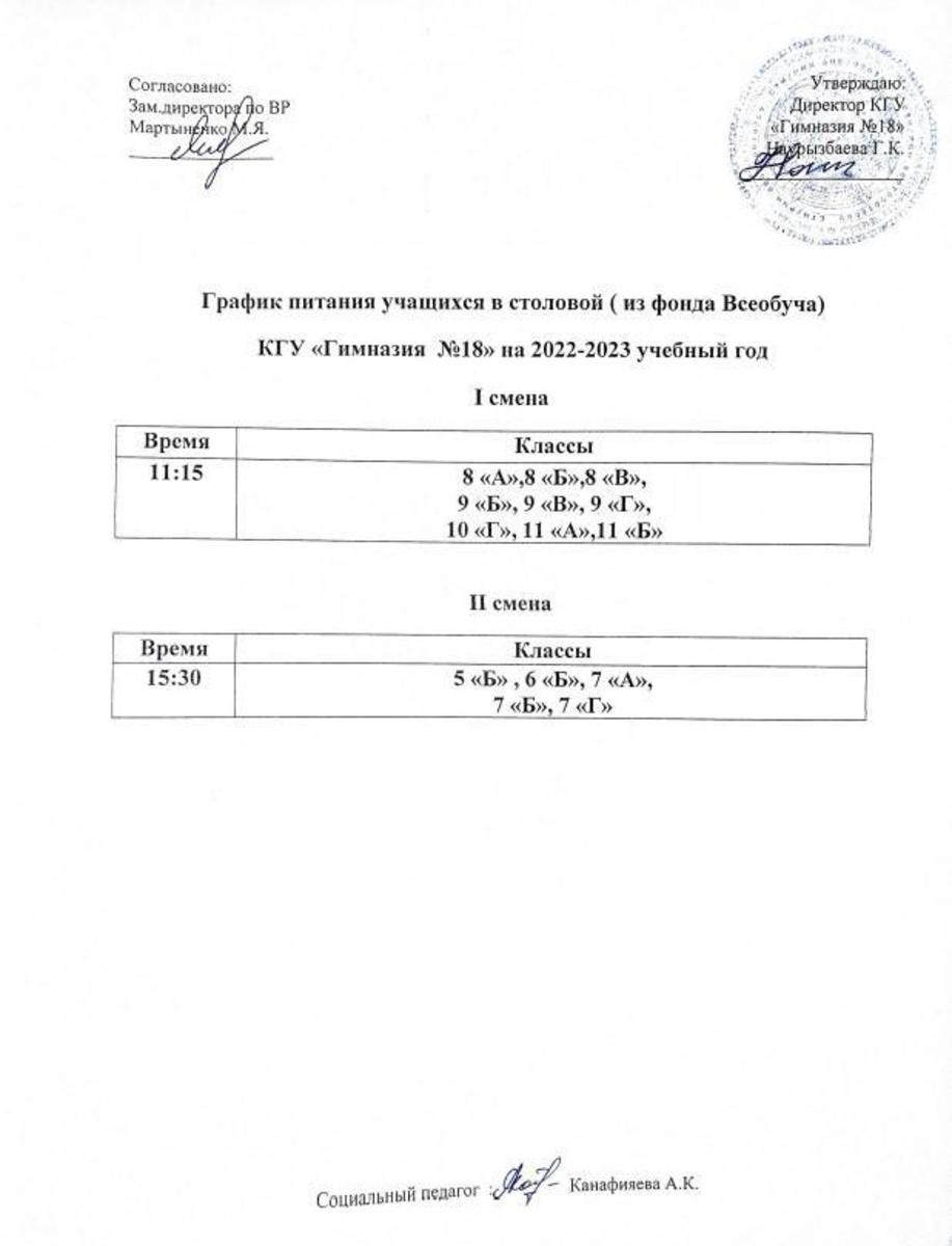 2021-2022 оқу жылына арналған асханасында (Всеобуч қорынан) оқушыларды тамақтандыру кестесі