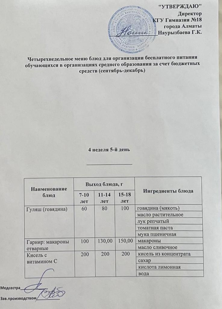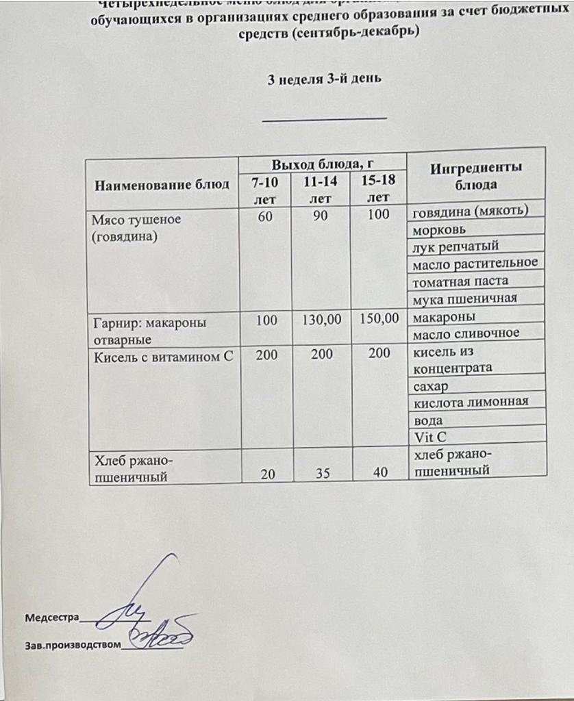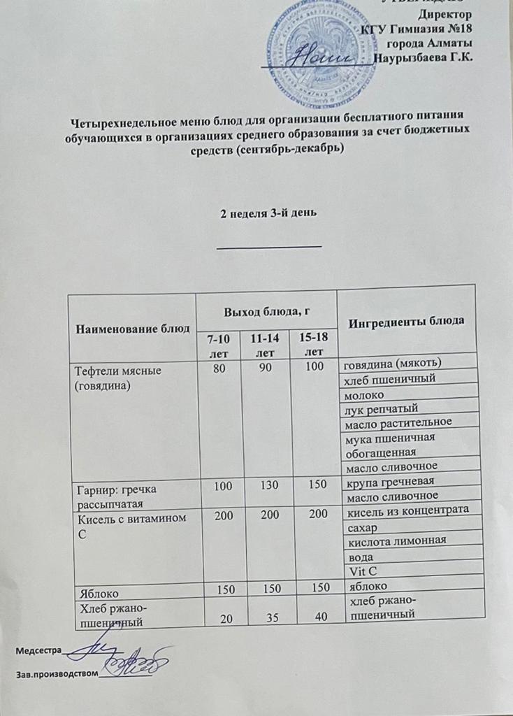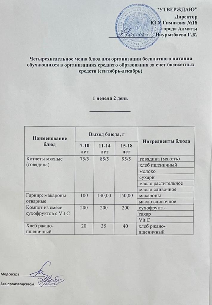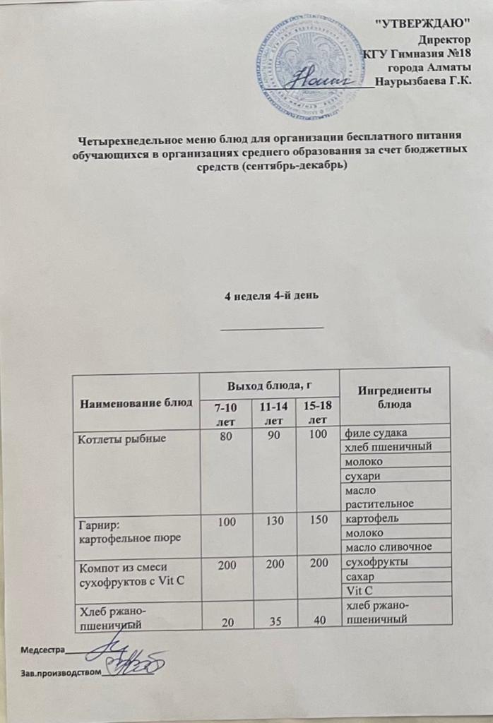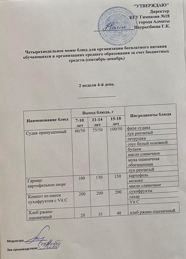05 қыркүйек 2022 0 1 2 3 4 5 Бюджет қаражаты есебінен орта білім беру ұйымдарында оқушыларды тегін тамақтандыруды ұйымдастыруға арналған төрт апталық тағамдар мәзірі (қыркүйек-желтоқсан) Осы беттің QR-коды:QR-код этой страницы: