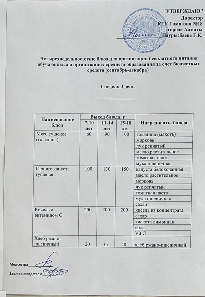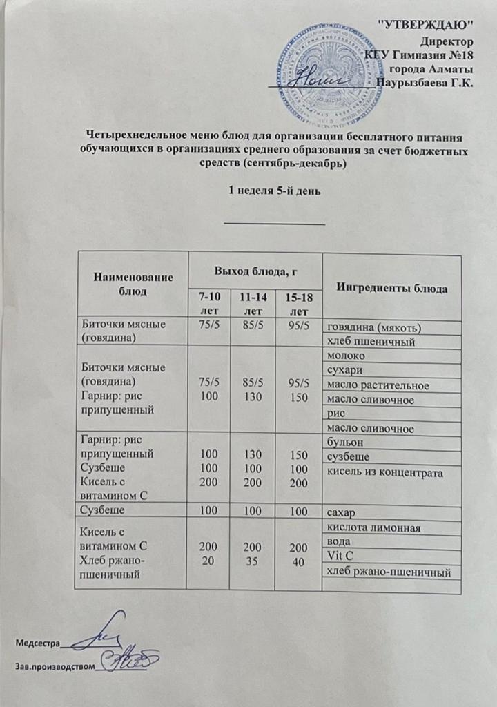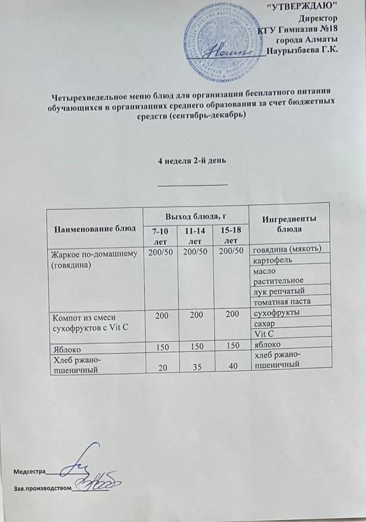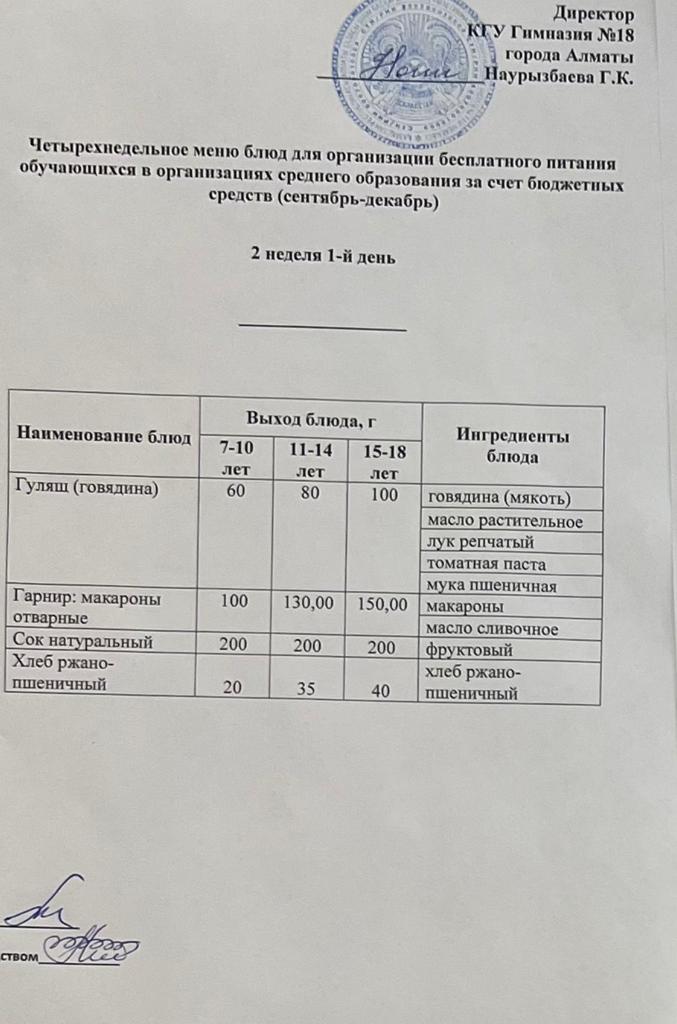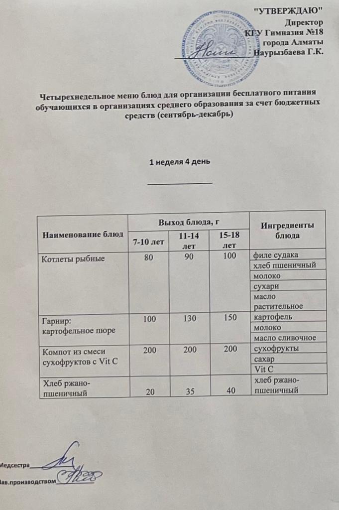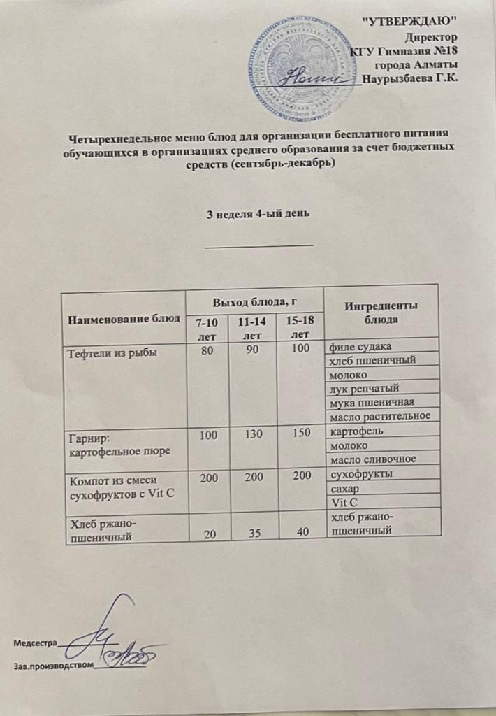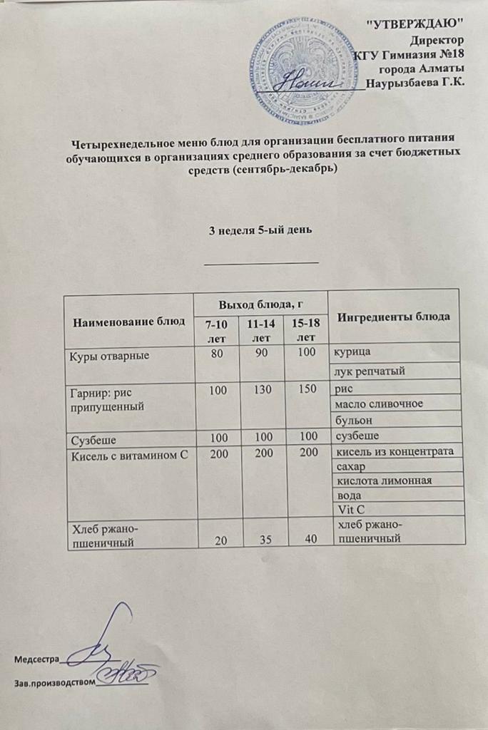 05 қыркүйек 2022 0 1 2 3 4 5 Бюджет қаражаты есебінен орта білім беру ұйымдарында оқушыларды тегін тамақтандыруды ұйымдастыруға арналған төрт апталық тағамдар мәзірі (қыркүйек-желтоқсан) Осы беттің QR-коды:QR-код этой страницы: