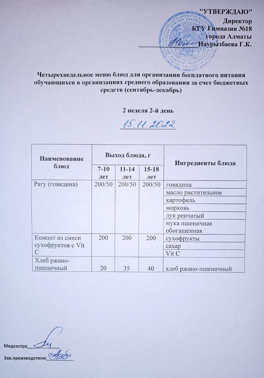 15 қараша 2022 0 1 2 3 4 5 Оқушыларға тегін берілетін тағамдардың мәзірі (қыркүйек-желтоқсан) 2 апта 2 күні Жалпыға бірдей білім беру қоры есебінен тегін тамақтанатын оқушыларға арналған 4 апталық ас мәзірі (қыркүйек-желтоқсан)2апта 2-ші күн Осы беттің QR-коды:QR-код этой страницы: