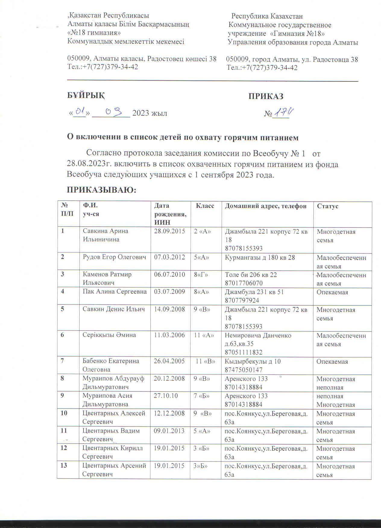 01 қыркүйек 2023 0 1 2 3 4 5 Бұйрық №174 Балаларды ыстық тамақпен қамту тізіміне енгізу туралы Осы беттің QR-коды:QR-код этой страницы: